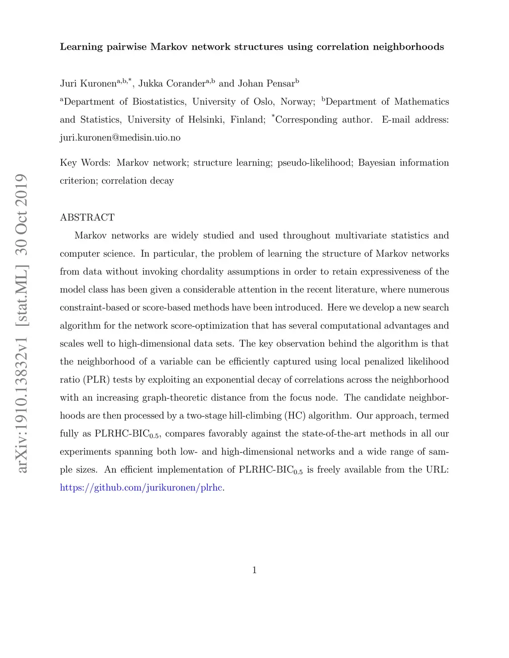 Markov networks are widely studied and used throughout multivariate statistics and computer science. In particular, the problem of learning the structure of Markov networks from data without invoking chordality assumptions in order to retain expressiveness of the model class has been given a considerable attention in the recent literature, where numerous constraint-based or score-based methods have been introduced. Here we develop a new search algorithm for the network score-optimization that has several computational advantages and scales well to high-dimensional data sets. The key observation behind the algorithm is that the neighborhood of a variable can be efficiently captured using local penalized likelihood ratio (PLR) tests by exploiting an exponential decay of correlations across the neighborhood with an increasing graph-theoretic distance from the focus node. The candidate neighborhoods are then processed by a two-stage hill-climbing (HC) algorithm. Our approach, termed fully as PLRHC-BIC, compares favorably against the state-of-the-art methods in all our experiments spanning both low- and high-dimensional networks and a wide range of sample sizes. An efficient implementation of PLRHC-BIC is freely available from the URL: https://github.com/jurikuronen/plrhc.
