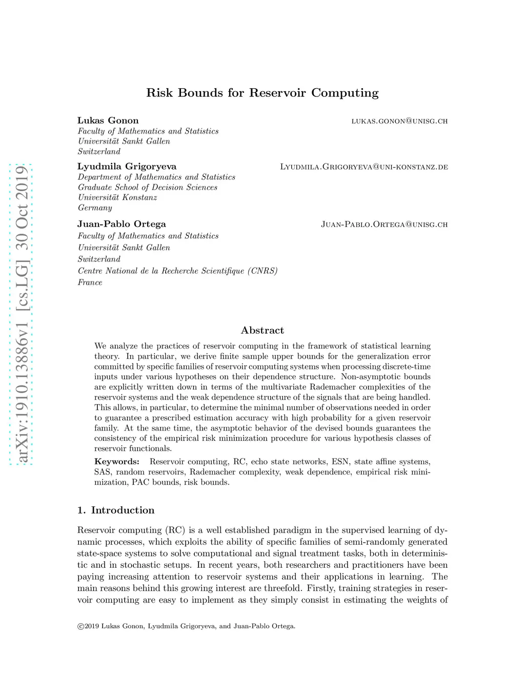 We analyze the practices of reservoir computing in the framework of statistical learning theory. In particular, we derive finite sample upper bounds for the generalization error committed by specific families of reservoir computing systems when processing discrete-time inputs under various hypotheses on their dependence structure. Non-asymptotic bounds are explicitly written down in terms of the multivariate Rademacher complexities of the reservoir systems and the weak dependence structure of the signals that are being handled. This allows, in particular, to determine the minimal number of observations needed in order to guarantee a prescribed estimation accuracy with high probability for a given reservoir family. At the same time, the asymptotic behavior of the devised bounds guarantees the consistency of the empirical risk minimization procedure for various hypothesis classes of reservoir functionals.