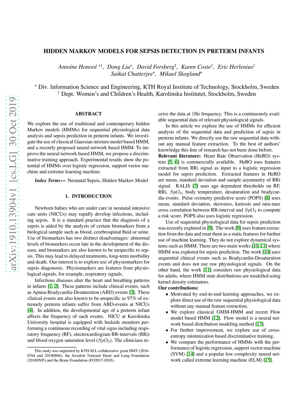 We explore the use of traditional and contemporary hidden Markov models (HMMs) for sequential physiological data analysis and sepsis prediction in preterm infants. We investigate the use of classical Gaussian mixture model based HMM, and a recently proposed neural network based HMM. To improve the neural network based HMM, we propose a discriminative training approach. Experimental results show the potential of HMMs over logistic regression, support vector machine and extreme learning machine.