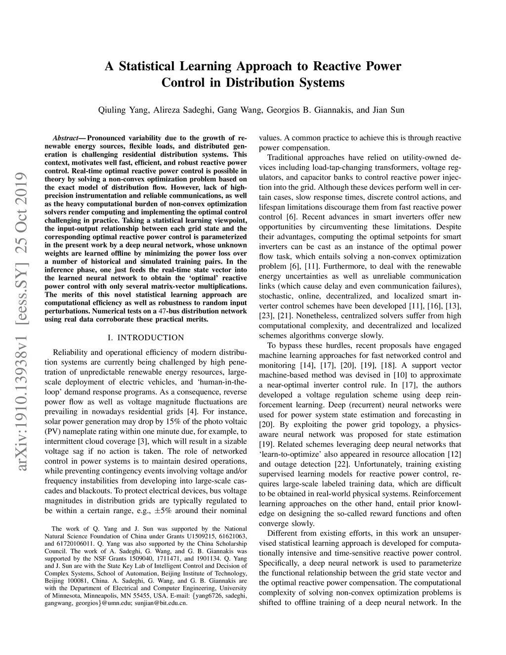 Pronounced variability due to the growth of renewable energy sources, flexible loads, and distributed generation is challenging residential distribution systems. This context, motivates well fast, efficient, and robust reactive power control. Real-time optimal reactive power control is possible in theory by solving a non-convex optimization problem based on the exact model of distribution flow. However, lack of high-precision instrumentation and reliable communications, as well as the heavy computational burden of non-convex optimization solvers render computing and implementing the optimal control challenging in practice. Taking a statistical learning viewpoint, the input-output relationship between each grid state and the corresponding optimal reactive power control is parameterized in the present work by a deep neural network, whose unknown weights are learned offline by minimizing the power loss over a number of historical and simulated training pairs. In the inference phase, one just feeds the real-time state vector into the learned neural network to obtain the `optimal' reactive power control with only several matrix-vector multiplications. The merits of this novel statistical learning approach are computational efficiency as well as robustness to random input perturbations. Numerical tests on a 47-bus distribution network using real data corroborate these practical merits.