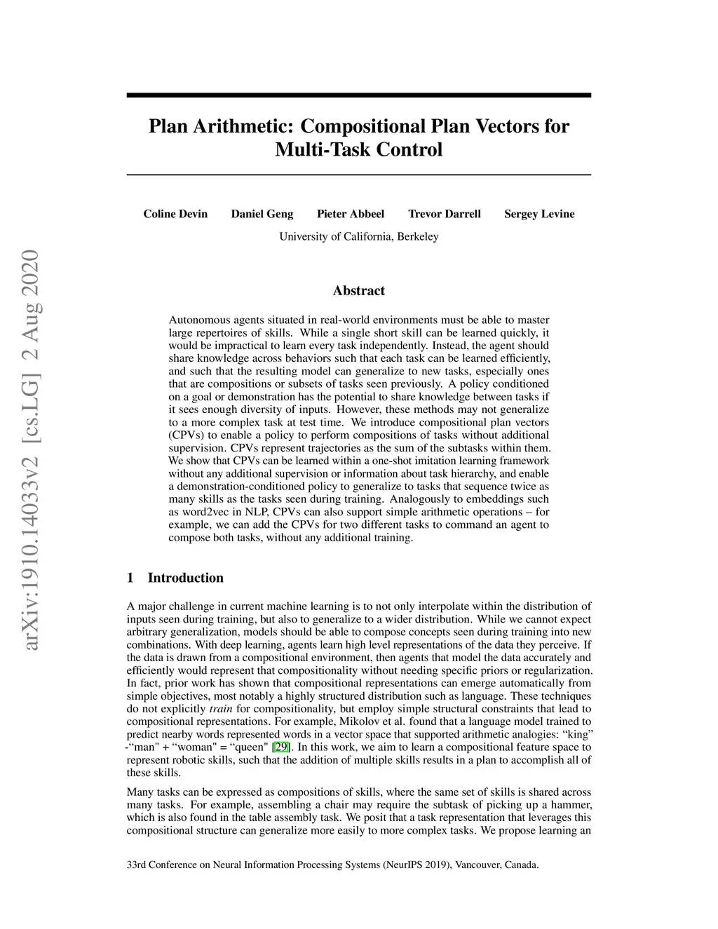 Autonomous agents situated in real-world environments must be able to master large repertoires of skills. While a single short skill can be learned quickly, it would be impractical to learn every task independently. Instead, the agent should share knowledge across behaviors such that each task can be learned efficiently, and such that the resulting model can generalize to new tasks, especially ones that are compositions or subsets of tasks seen previously. A policy conditioned on a goal or demonstration has the potential to share knowledge between tasks if it sees enough diversity of inputs. However, these methods may not generalize to a more complex task at test time. We introduce compositional plan vectors (CPVs) to enable a policy to perform compositions of tasks without additional supervision. CPVs represent trajectories as the sum of the subtasks within them. We show that CPVs can be learned within a one-shot imitation learning framework without any additional supervision or information about task hierarchy, and enable a demonstration-conditioned policy to generalize to tasks that sequence twice as many skills as the tasks seen during training. Analogously to embeddings such as word2vec in NLP, CPVs can also support simple arithmetic operations -- for example, we can add the CPVs for two different tasks to command an agent to compose both tasks, without any additional training.