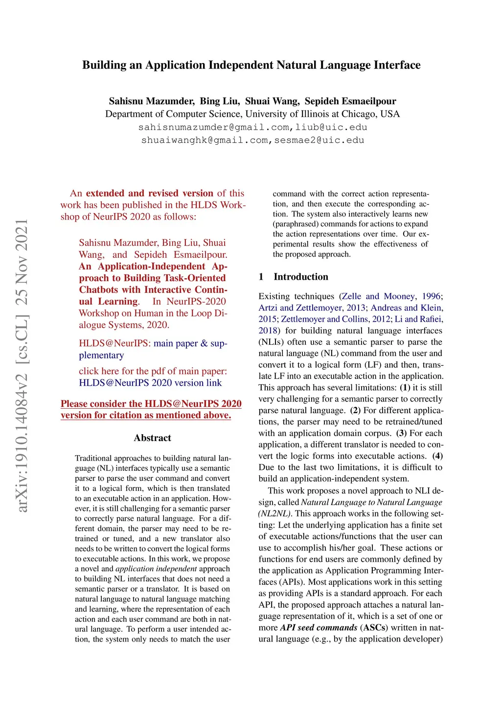 Traditional approaches to building natural language (NL) interfaces typically use a semantic parser to parse the user command and convert it to a logical form, which is then translated to an executable action in an application. However, it is still challenging for a semantic parser to correctly parse natural language. For a different domain, the parser may need to be retrained or tuned, and a new translator also needs to be written to convert the logical forms to executable actions. In this work, we propose a novel and application independent approach to building NL interfaces that does not need a semantic parser or a translator. It is based on natural language to natural language matching and learning, where the representation of each action and each user command are both in natural language. To perform a user intended action, the system only needs to match the user command with the correct action representation, and then execute the corresponding action. The system also interactively learns new (paraphrased) commands for actions to expand the action representations over time. Our experimental results show the effectiveness of the proposed approach.