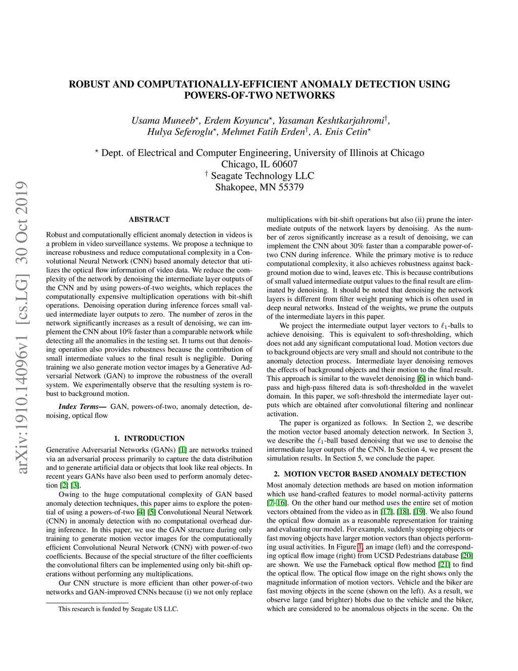 Robust and computationally efficient anomaly detection in videos is a problem in video surveillance systems. We propose a technique to increase robustness and reduce computational complexity in a Convolutional Neural Network (CNN) based anomaly detector that utilizes the optical flow information of video data. We reduce the complexity of the network by denoising the intermediate layer outputs of the CNN and by using powers-of-two weights, which replaces the computationally expensive multiplication operations with bit-shift operations. Denoising operation during inference forces small valued intermediate layer outputs to zero. The number of zeros in the network significantly increases as a result of denoising, we can implement the CNN about 10% faster than a comparable network while detecting all the anomalies in the testing set. It turns out that denoising operation also provides robustness because the contribution of small intermediate values to the final result is negligible. During training we also generate motion vector images by a Generative Adversarial Network (GAN) to improve the robustness of the overall system. We experimentally observe that the resulting system is robust to background motion.
