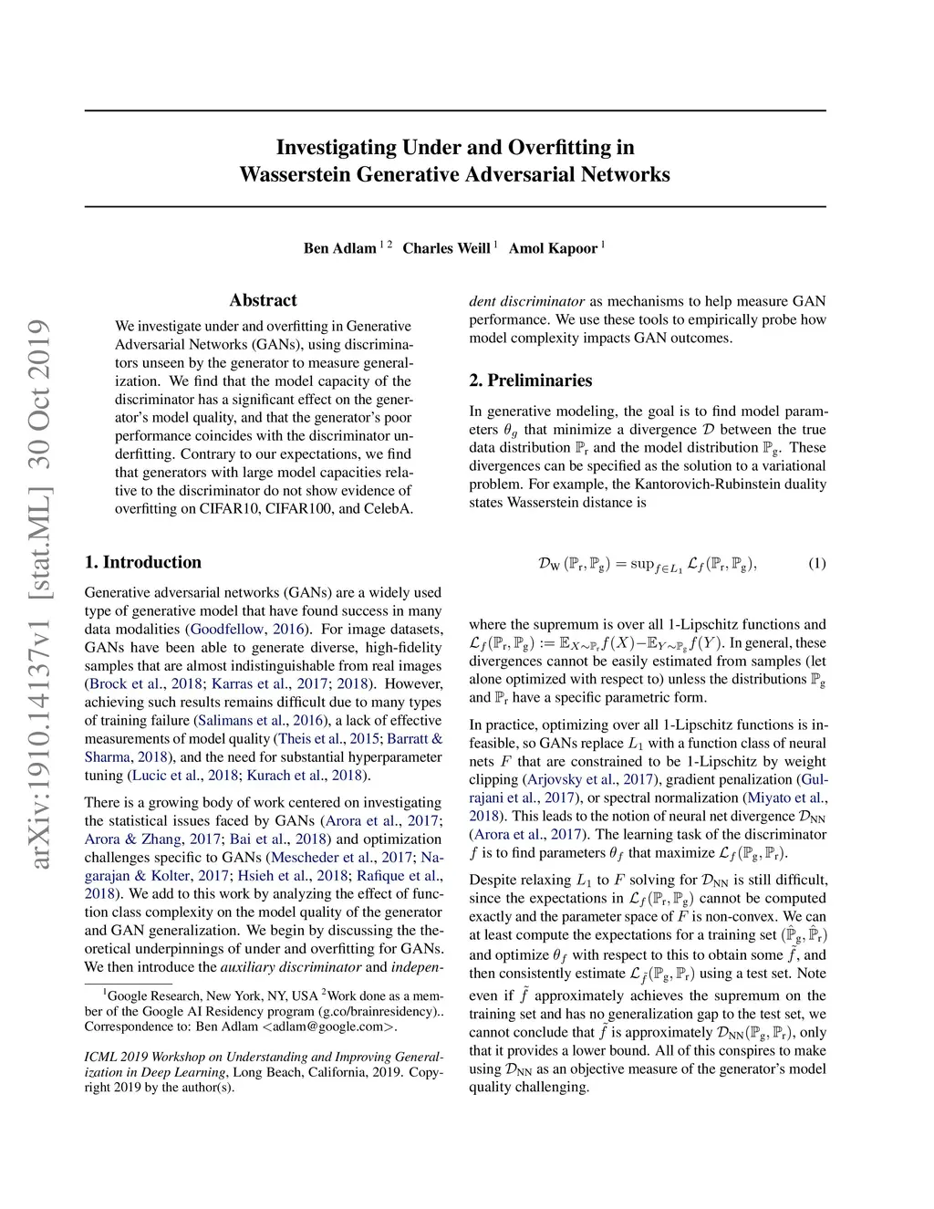 We investigate under and overfitting in Generative Adversarial Networks (GANs), using discriminators unseen by the generator to measure generalization. We find that the model capacity of the discriminator has a significant effect on the generator's model quality, and that the generator's poor performance coincides with the discriminator underfitting. Contrary to our expectations, we find that generators with large model capacities relative to the discriminator do not show evidence of overfitting on CIFAR10, CIFAR100, and CelebA.