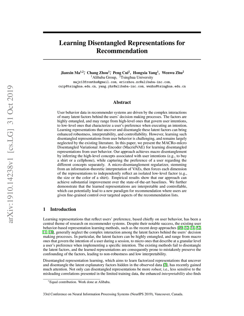 User behavior data in recommender systems are driven by the complex interactions of many latent factors behind the users' decision making processes. The factors are highly entangled, and may range from high-level ones that govern user intentions, to low-level ones that characterize a user's preference when executing an intention. Learning representations that uncover and disentangle these latent factors can bring enhanced robustness, interpretability, and controllability. However, learning such disentangled representations from user behavior is challenging, and remains largely neglected by the existing literature. In this paper, we present the MACRo-mIcro Disentangled Variational Auto-Encoder (MacridVAE) for learning disentangled representations from user behavior. Our approach achieves macro disentanglement by inferring the high-level concepts associated with user intentions (e.g., to buy a shirt or a cellphone), while capturing the preference of a user regarding the different concepts separately. A micro-disentanglement regularizer, stemming from an information-theoretic interpretation of VAEs, then forces each dimension of the representations to independently reflect an isolated low-level factor (e.g., the size or the color of a shirt). Empirical results show that our approach can achieve substantial improvement over the state-of-the-art baselines. We further demonstrate that the learned representations are interpretable and controllable, which can potentially lead to a new paradigm for recommendation where users are given fine-grained control over targeted aspects of the recommendation lists.
