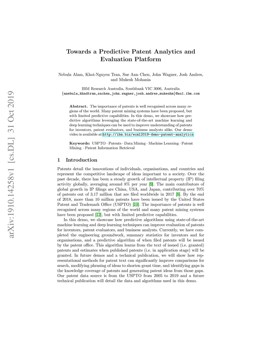 The importance of patents is well recognised across many regions of the world. Many patent mining systems have been proposed, but with limited predictive capabilities. In this demo, we showcase how predictive algorithms leveraging the state-of-the-art machine learning and deep learning techniques can be used to improve understanding of patents for inventors, patent evaluators, and business analysts alike. Our demo video is available at http://ibm.biz/ecml2019-demo-patent-analytics