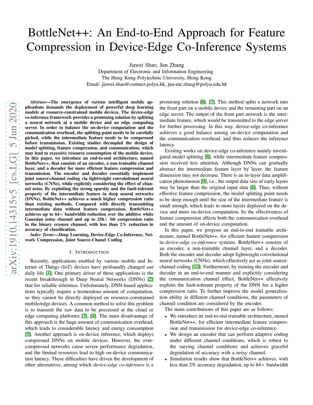 BottleNet++: An End-to-End Approach for Feature Compression in