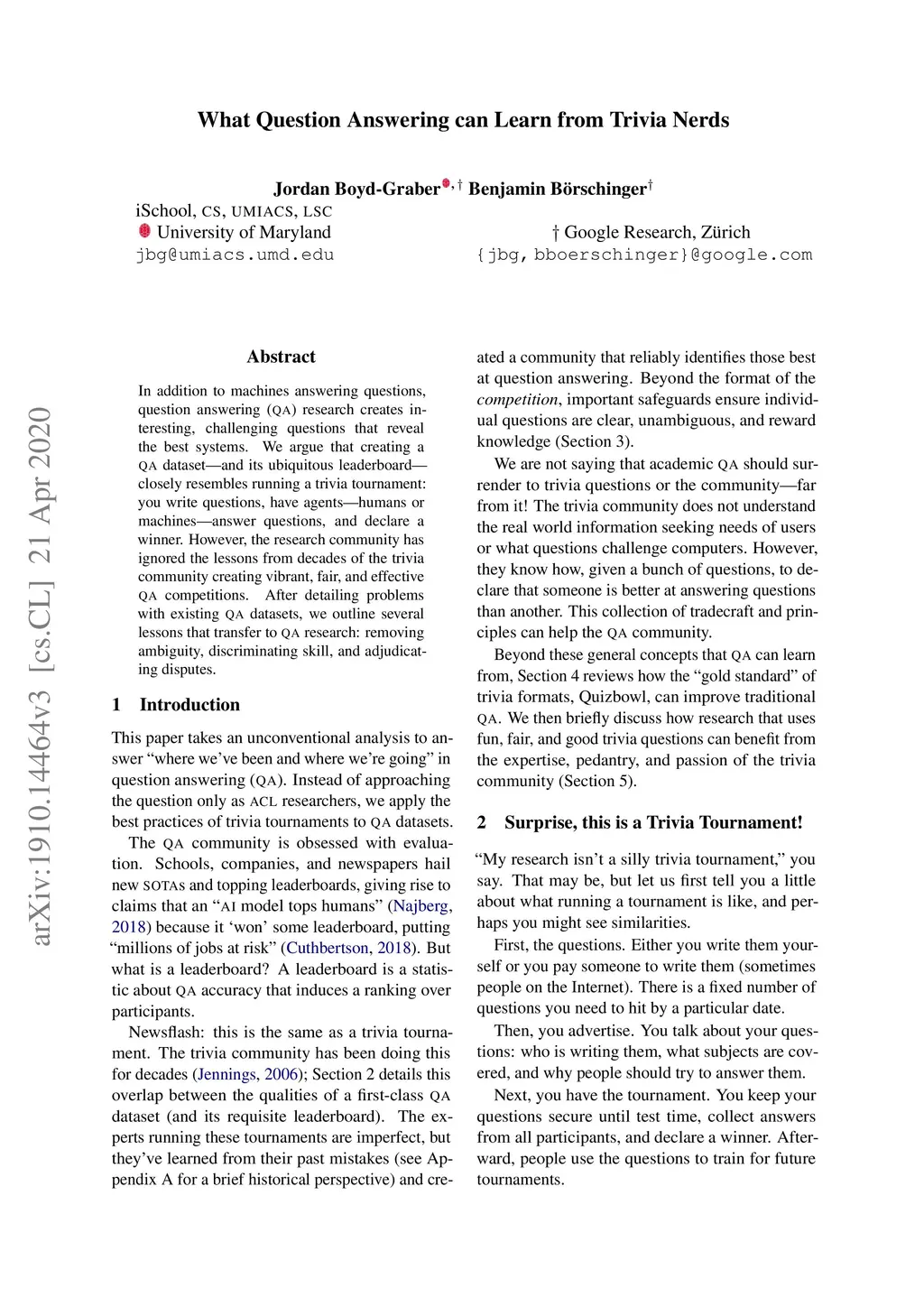 In addition to the traditional task of getting machines to answer questions, a major research question in question answering is to create interesting, challenging questions that can help systems learn how to answer questions and also reveal which systems are the best at answering questions. We argue that creating a question answering dataset -- and the ubiquitous leaderboard that goes with it -- closely resembles running a trivia tournament: you write questions, have agents (either humans or machines) answer the questions, and declare a winner. However, the research community has ignored the decades of hard-learned lessons from decades of the trivia community creating vibrant, fair, and effective question answering competitions. After detailing problems with existing QA datasets, we outline the key lessons -- removing ambiguity, discriminating skill, and adjudicating disputes -- that can transfer to QA research and how they might be implemented for the QA community.