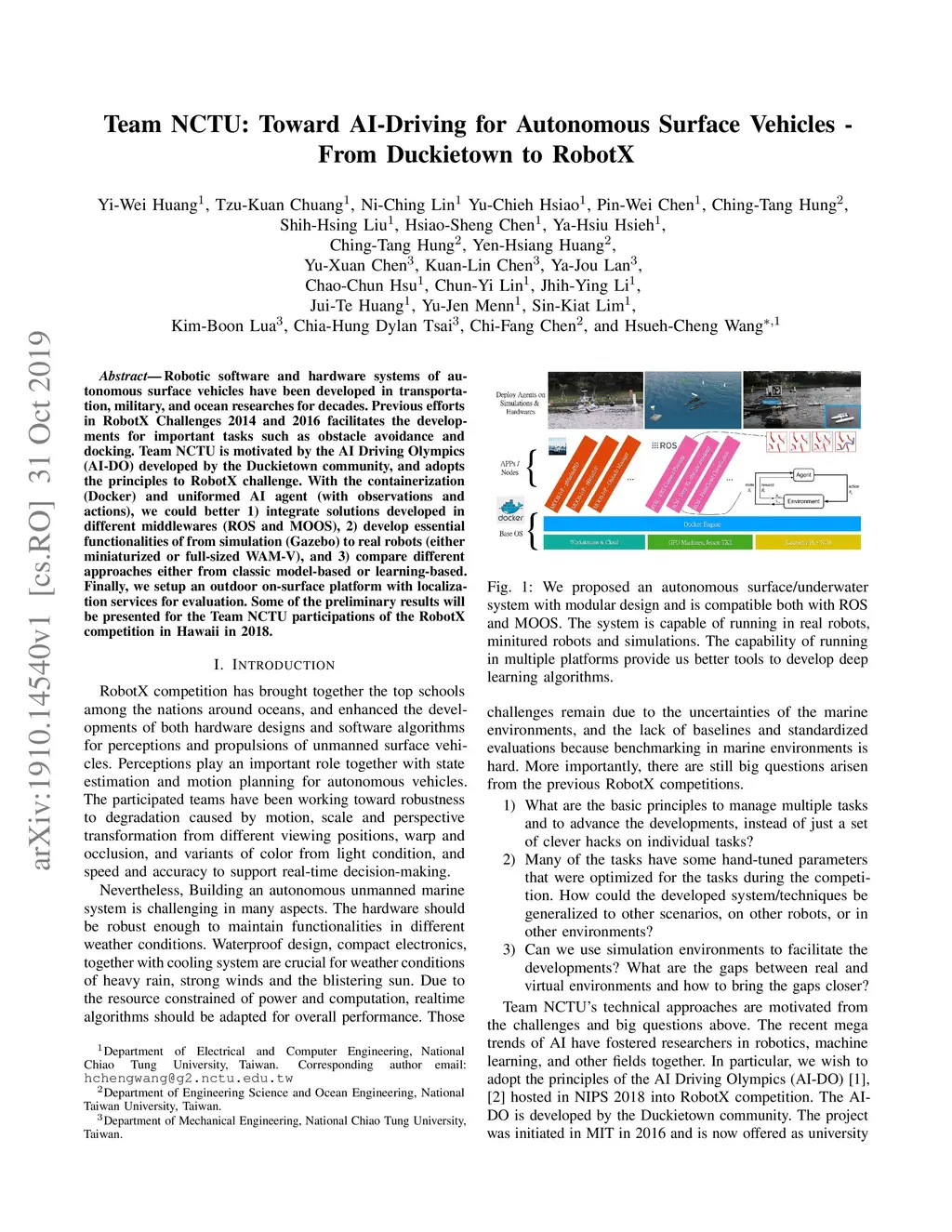 Robotic software and hardware systems of autonomous surface vehicles have been developed in transportation, military, and ocean researches for decades. Previous efforts in RobotX Challenges 2014 and 2016 facilitates the developments for important tasks such as obstacle avoidance and docking. Team NCTU is motivated by the AI Driving Olympics (AI-DO) developed by the Duckietown community, and adopts the principles to RobotX challenge. With the containerization (Docker) and uniformed AI agent (with observations and actions), we could better 1) integrate solutions developed in different middlewares (ROS and MOOS), 2) develop essential functionalities of from simulation (Gazebo) to real robots (either miniaturized or full-sized WAM-V), and 3) compare different approaches either from classic model-based or learning-based. Finally, we setup an outdoor on-surface platform with localization services for evaluation. Some of the preliminary results will be presented for the Team NCTU participations of the RobotX competition in Hawaii in 2018.