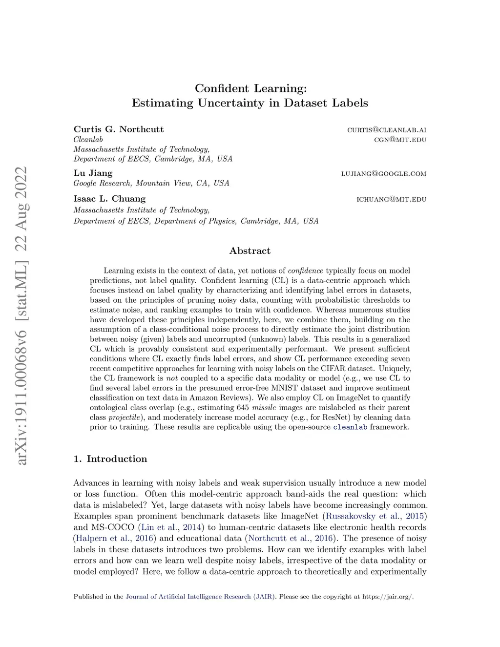 Confident Learning: Estimating Uncertainty in Dataset Labels