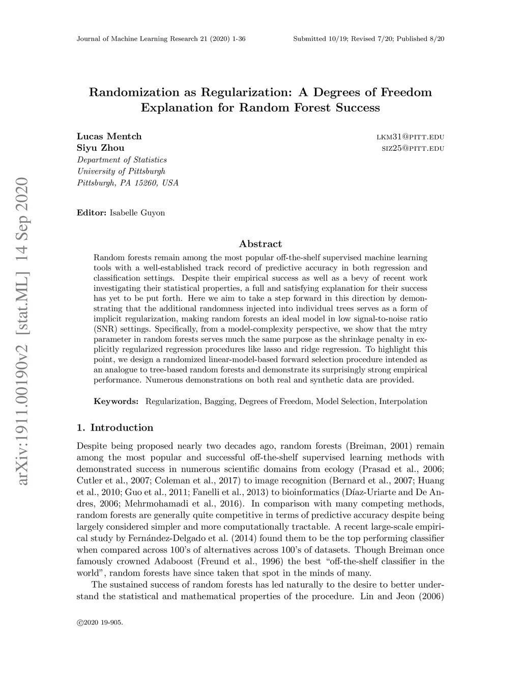 Random forests remain among the most popular off-the-shelf supervised machine learning tools with a well-established track record of predictive accuracy in both regression and classification settings. Despite their empirical success as well as a bevy of recent work investigating their statistical properties, a full and satisfying explanation for their success has yet to be put forth. Here we aim to take a step forward in this direction by demonstrating that the additional randomness injected into individual trees serves as a form of implicit regularization, making random forests an ideal model in low signal-to-noise ratio (SNR) settings. Specifically, from a model-complexity perspective, we show that the mtry parameter in random forests serves much the same purpose as the shrinkage penalty in explicitly regularized regression procedures like lasso and ridge regression. To highlight this point, we design a randomized linear-model-based forward selection procedure intended as an analogue to tree-based random forests and demonstrate its surprisingly strong empirical performance. Numerous demonstrations on both real and synthetic data are provided.