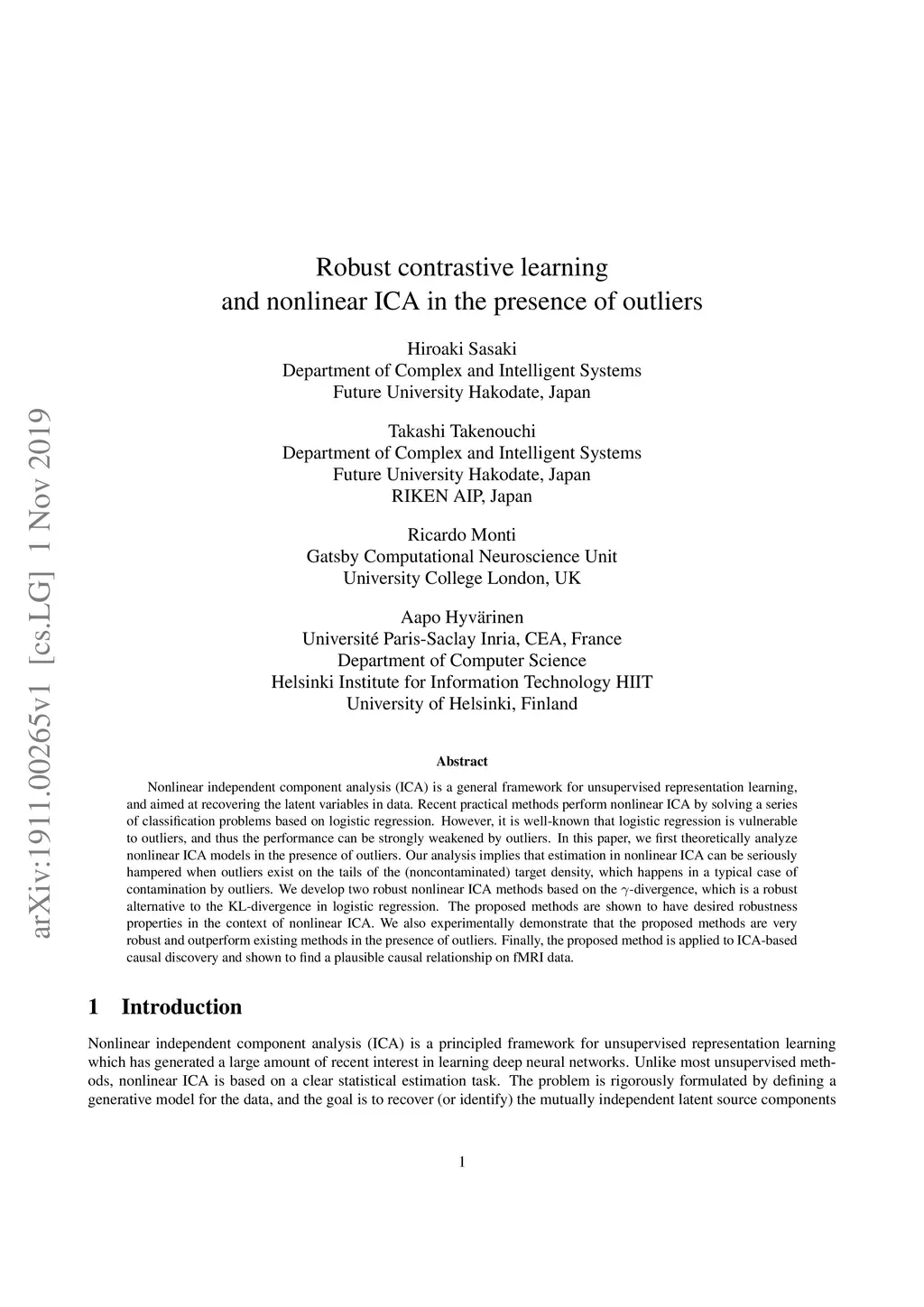 Nonlinear independent component analysis (ICA) is a general framework for unsupervised representation learning, and aimed at recovering the latent variables in data. Recent practical methods perform nonlinear ICA by solving a series of classification problems based on logistic regression. However, it is well-known that logistic regression is vulnerable to outliers, and thus the performance can be strongly weakened by outliers. In this paper, we first theoretically analyze nonlinear ICA models in the presence of outliers. Our analysis implies that estimation in nonlinear ICA can be seriously hampered when outliers exist on the tails of the (noncontaminated) target density, which happens in a typical case of contamination by outliers. We develop two robust nonlinear ICA methods based on the {\gamma}-divergence, which is a robust alternative to the KL-divergence in logistic regression. The proposed methods are shown to have desired robustness properties in the context of nonlinear ICA. We also experimentally demonstrate that the proposed methods are very robust and outperform existing methods in the presence of outliers. Finally, the proposed method is applied to ICA-based causal discovery and shown to find a plausible causal relationship on fMRI data.
