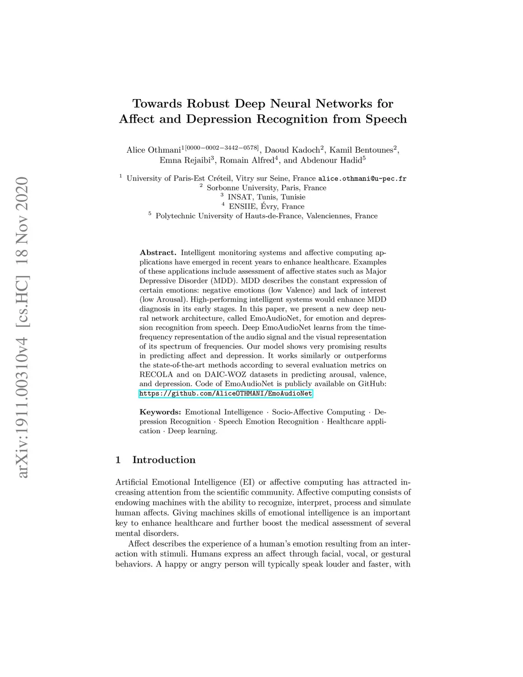 Intelligent monitoring systems and affective computing applications have emerged in recent years to enhance healthcare. Examples of these applications include assessment of affective states such as Major Depressive Disorder (MDD). MDD describes the constant expression of certain emotions: negative emotions (low Valence) and lack of interest (low Arousal). High-performing intelligent systems would enhance MDD diagnosis in its early stages. In this paper, we present a new deep neural network architecture, called EmoAudioNet, for emotion and depression recognition from speech. Deep EmoAudioNet learns from the time-frequency representation of the audio signal and the visual representation of its spectrum of frequencies. Our model shows very promising results in predicting affect and depression. It works similarly or outperforms the state-of-the-art methods according to several evaluation metrics on RECOLA and on DAIC-WOZ datasets in predicting arousal, valence, and depression. Code of EmoAudioNet is publicly available on GitHub: https://github.com/AliceOTHMANI/EmoAudioNet