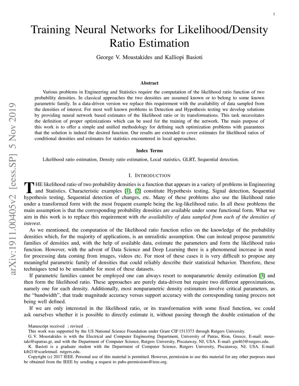 Various problems in Engineering and Statistics require the computation of the likelihood ratio function of two probability densities. In classical approaches the two densities are assumed known or to belong to some known parametric family. In a data-driven version we replace this requirement with the availability of data sampled from the densities of interest. For most well known problems in Detection and Hypothesis testing we develop solutions by providing neural network based estimates of the likelihood ratio or its transformations. This task necessitates the definition of proper optimizations which can be used for the training of the network. The main purpose of this work is to offer a simple and unified methodology for defining such optimization problems with guarantees that the solution is indeed the desired function. Our results are extended to cover estimates for likelihood ratios of conditional densities and estimates for statistics encountered in local approaches.