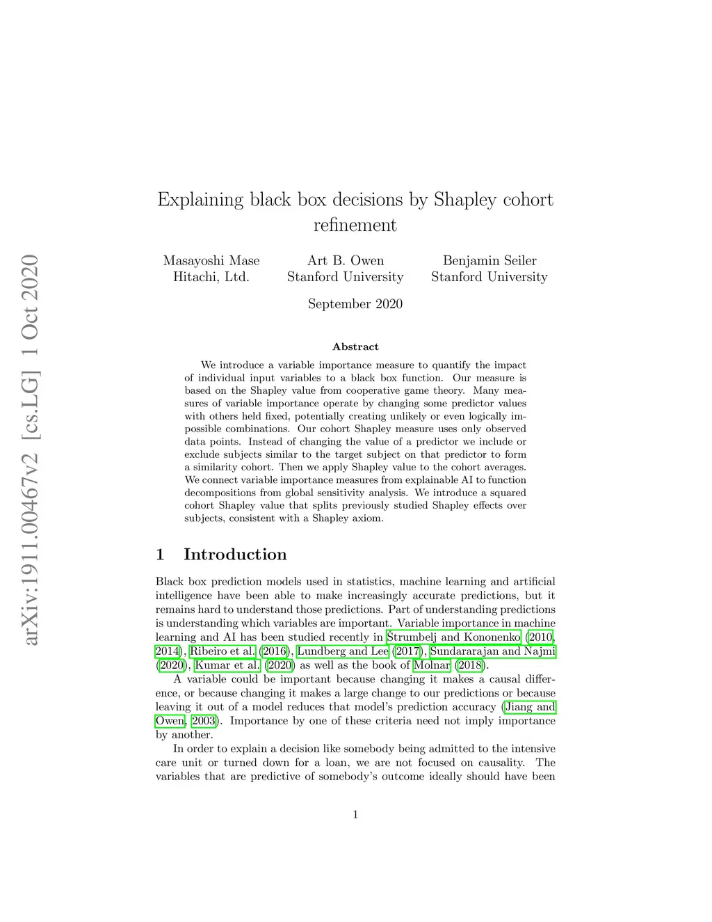 We introduce a variable importance measure to explain the importance of individual variables to a decision made by a black box function. Our measure is based on the Shapley value from cooperative game theory. Measures of variable importance usually work by changing the value of one or more variables with the others held fixed and then recomputing the function of interest. That approach is problematic because it can create very unrealistic combinations of predictors that never appear in practice or that were never present when the prediction function was being created. Our cohort refinement Shapley approach measures variable importance without using any data points that were not actually observed.