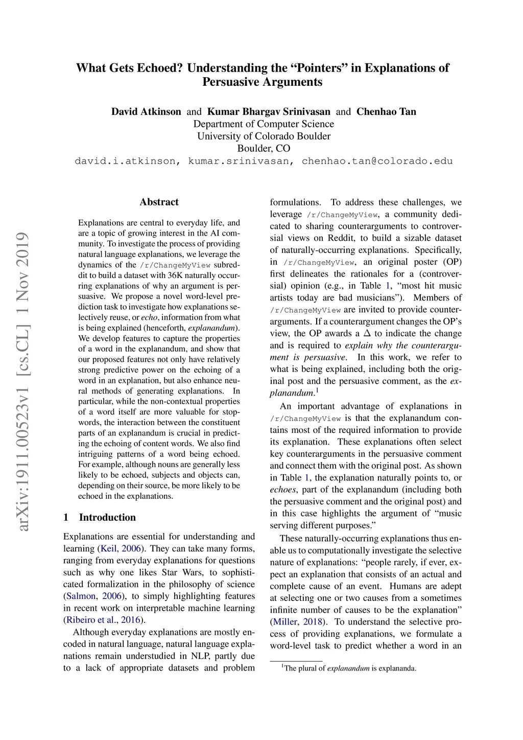 Explanations are central to everyday life, and are a topic of growing interest in the AI community. To investigate the process of providing natural language explanations, we leverage the dynamics of the /r/ChangeMyView subreddit to build a dataset with 36K naturally occurring explanations of why an argument is persuasive. We propose a novel word-level prediction task to investigate how explanations selectively reuse, or echo, information from what is being explained (henceforth, explanandum). We develop features to capture the properties of a word in the explanandum, and show that our proposed features not only have relatively strong predictive power on the echoing of a word in an explanation, but also enhance neural methods of generating explanations. In particular, while the non-contextual properties of a word itself are more valuable for stopwords, the interaction between the constituent parts of an explanandum is crucial in predicting the echoing of content words. We also find intriguing patterns of a word being echoed. For example, although nouns are generally less likely to be echoed, subjects and objects can, depending on their source, be more likely to be echoed in the explanations.