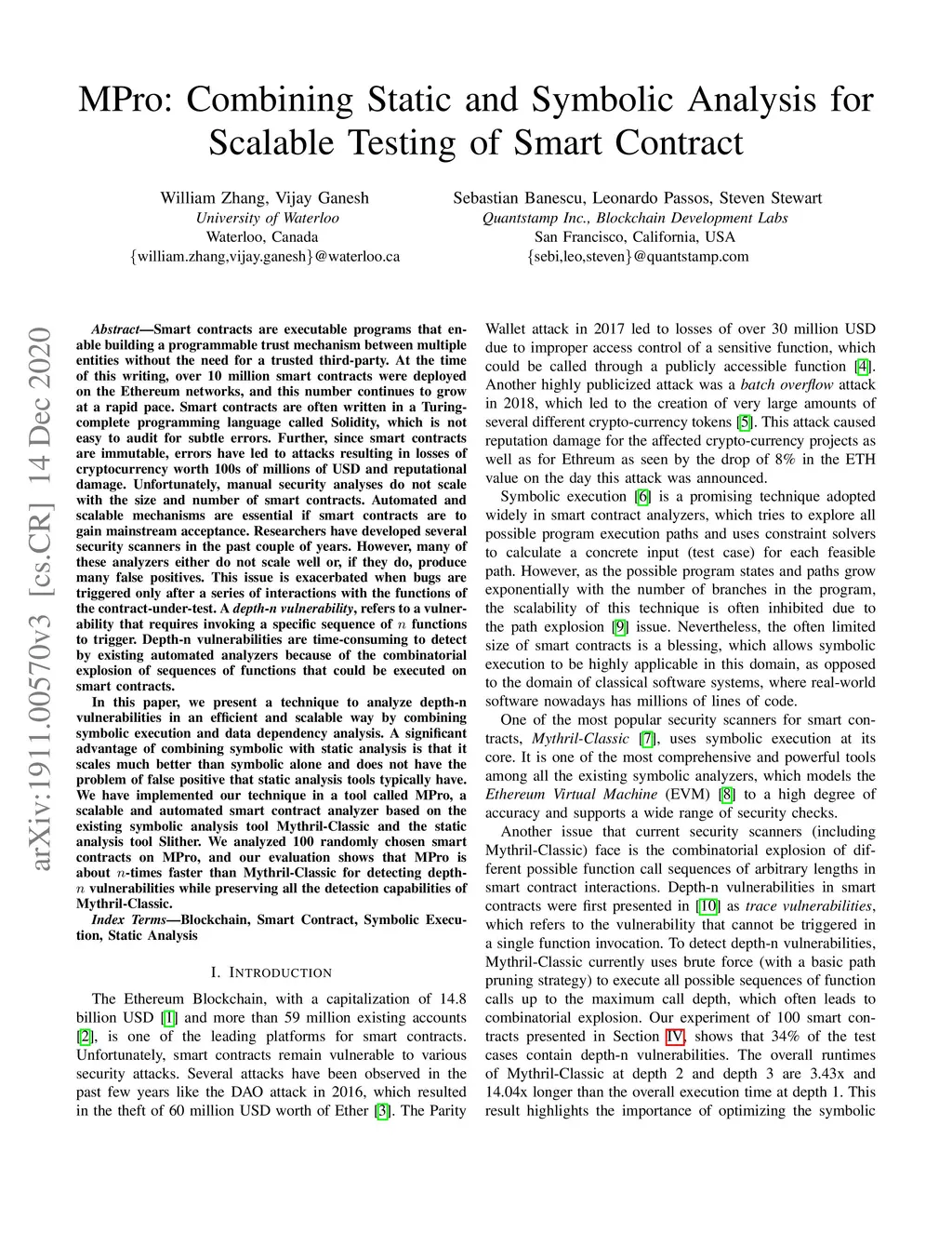 Smart contracts are executable programs that enable the building of a programmable trust mechanism between multiple entities without the need of a trusted third-party. Researchers have developed several security scanners in the past couple of years. However, many of these analyzers either do not scale well, or if they do, produce many false positives. This issue is exacerbated when bugs are triggered only after a series of interactions with the functions of the contract-under-test. A depth-n vulnerability, refers to a vulnerability that requires invoking a specific sequence of n functions to trigger. Depth-n vulnerabilities are time-consuming to detect by existing automated analyzers, because of the combinatorial explosion of sequences of functions that could be executed on smart contracts. In this paper, we present a technique to analyze depth-n vulnerabilities in an efficient and scalable way by combining symbolic execution and data dependency analysis. A significant advantage of combining symbolic with static analysis is that it scales much better than symbolic alone and does not have the problem of false positive that static analysis tools typically have. We have implemented our technique in a tool called MPro, a scalable and automated smart contract analyzer based on the existing symbolic analysis tool Mythril-Classic and the static analysis tool Slither. We analyzed 100 randomly chosen smart contracts on MPro and our evaluation shows that MPro is about n-times faster than Mythril-Classic for detecting depth-n vulnerabilities, while preserving all the detection capabilities of Mythril-Classic.