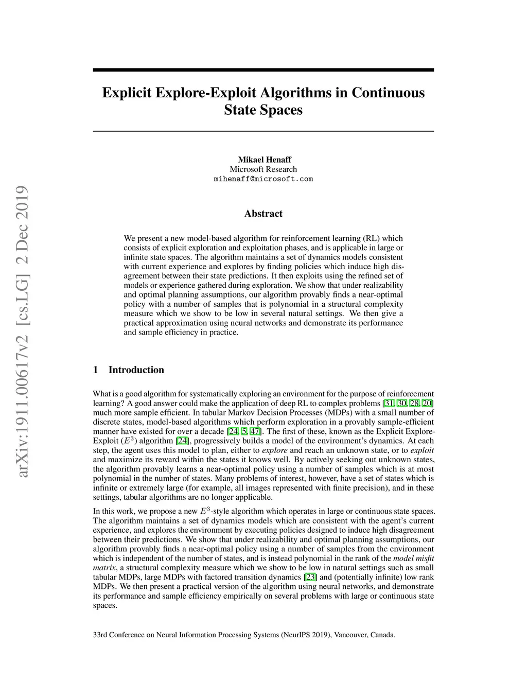 Explicit Explore-Exploit Algorithms in Continuous State Spaces