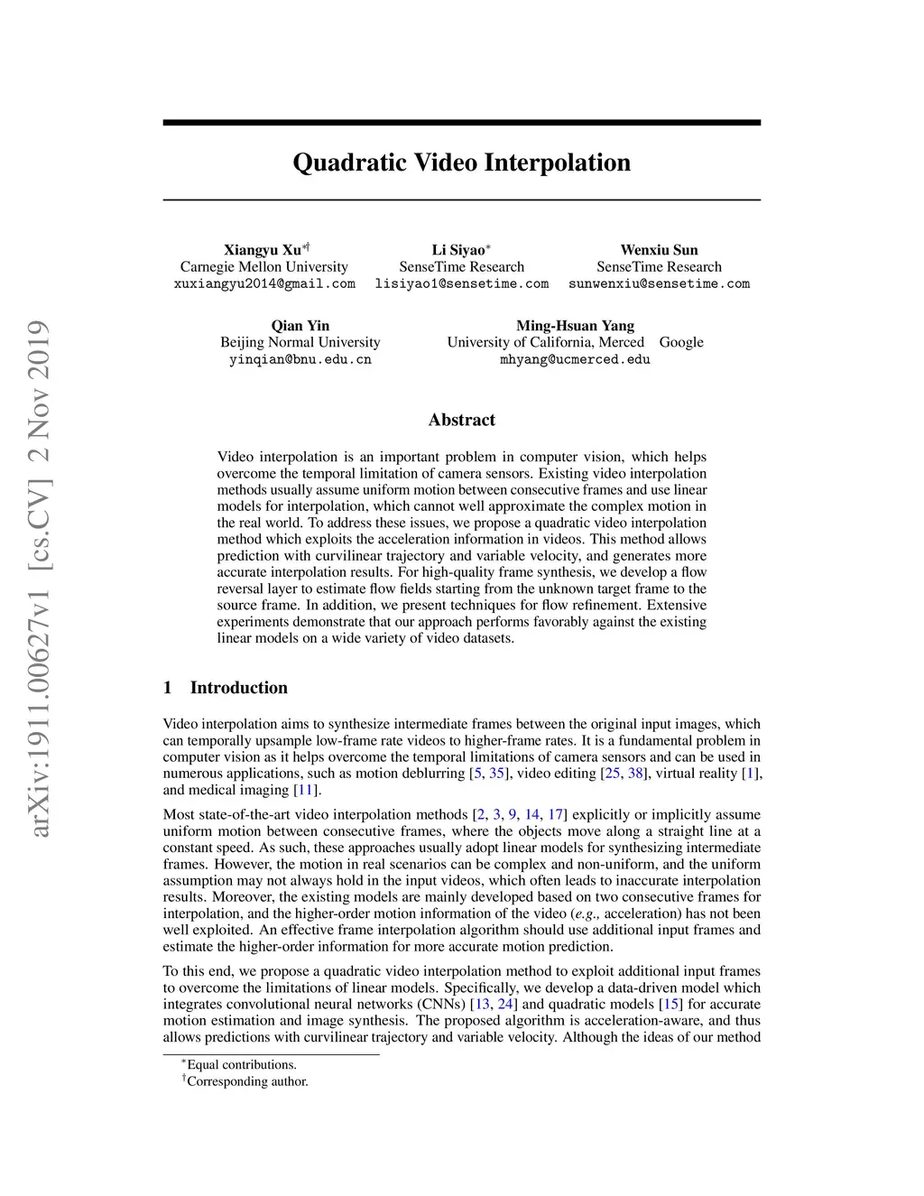 Video interpolation is an important problem in computer vision, which helps overcome the temporal limitation of camera sensors. Existing video interpolation methods usually assume uniform motion between consecutive frames and use linear models for interpolation, which cannot well approximate the complex motion in the real world. To address these issues, we propose a quadratic video interpolation method which exploits the acceleration information in videos. This method allows prediction with curvilinear trajectory and variable velocity, and generates more accurate interpolation results. For high-quality frame synthesis, we develop a flow reversal layer to estimate flow fields starting from the unknown target frame to the source frame. In addition, we present techniques for flow refinement. Extensive experiments demonstrate that our approach performs favorably against the existing linear models on a wide variety of video datasets.