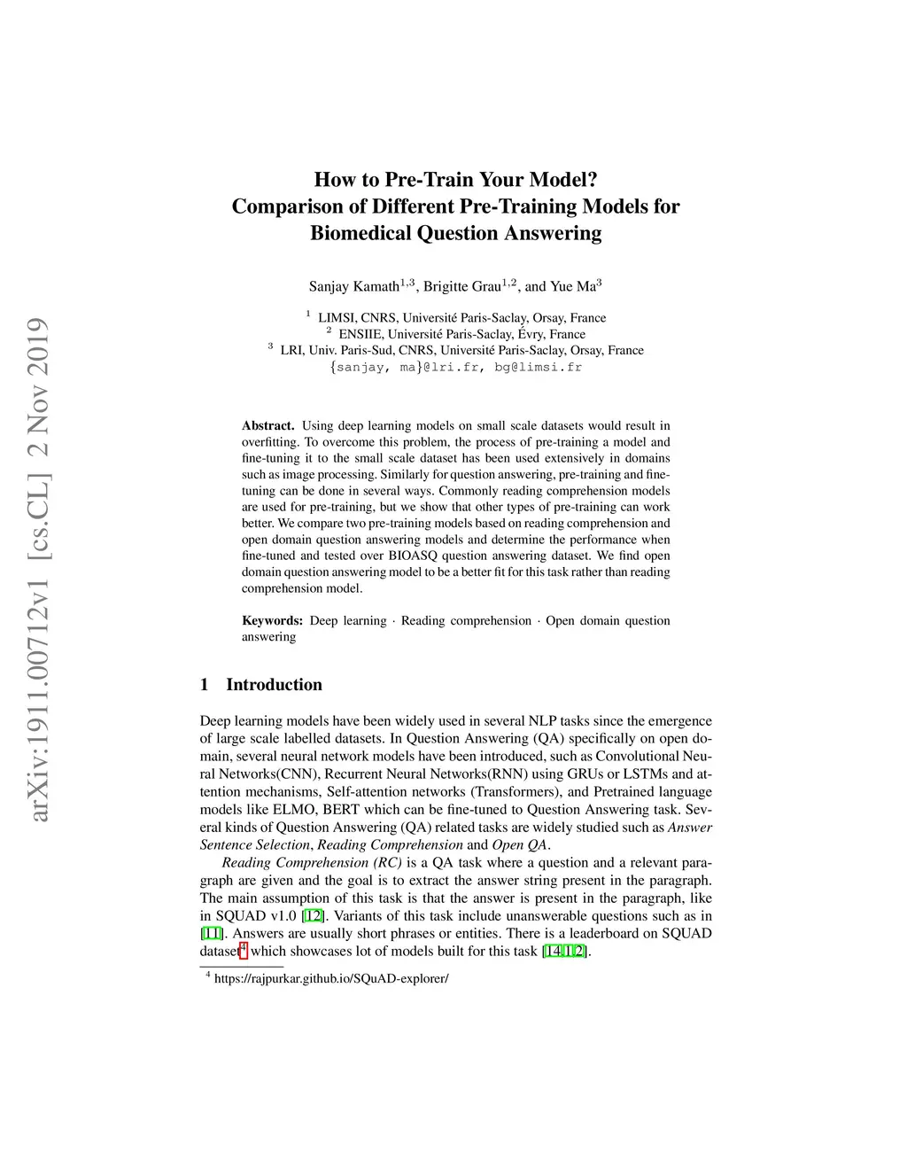 Using deep learning models on small scale datasets would result in overfitting. To overcome this problem, the process of pre-training a model and fine-tuning it to the small scale dataset has been used extensively in domains such as image processing. Similarly for question answering, pre-training and fine-tuning can be done in several ways. Commonly reading comprehension models are used for pre-training, but we show that other types of pre-training can work better. We compare two pre-training models based on reading comprehension and open domain question answering models and determine the performance when fine-tuned and tested over BIOASQ question answering dataset. We find open domain question answering model to be a better fit for this task rather than reading comprehension model.