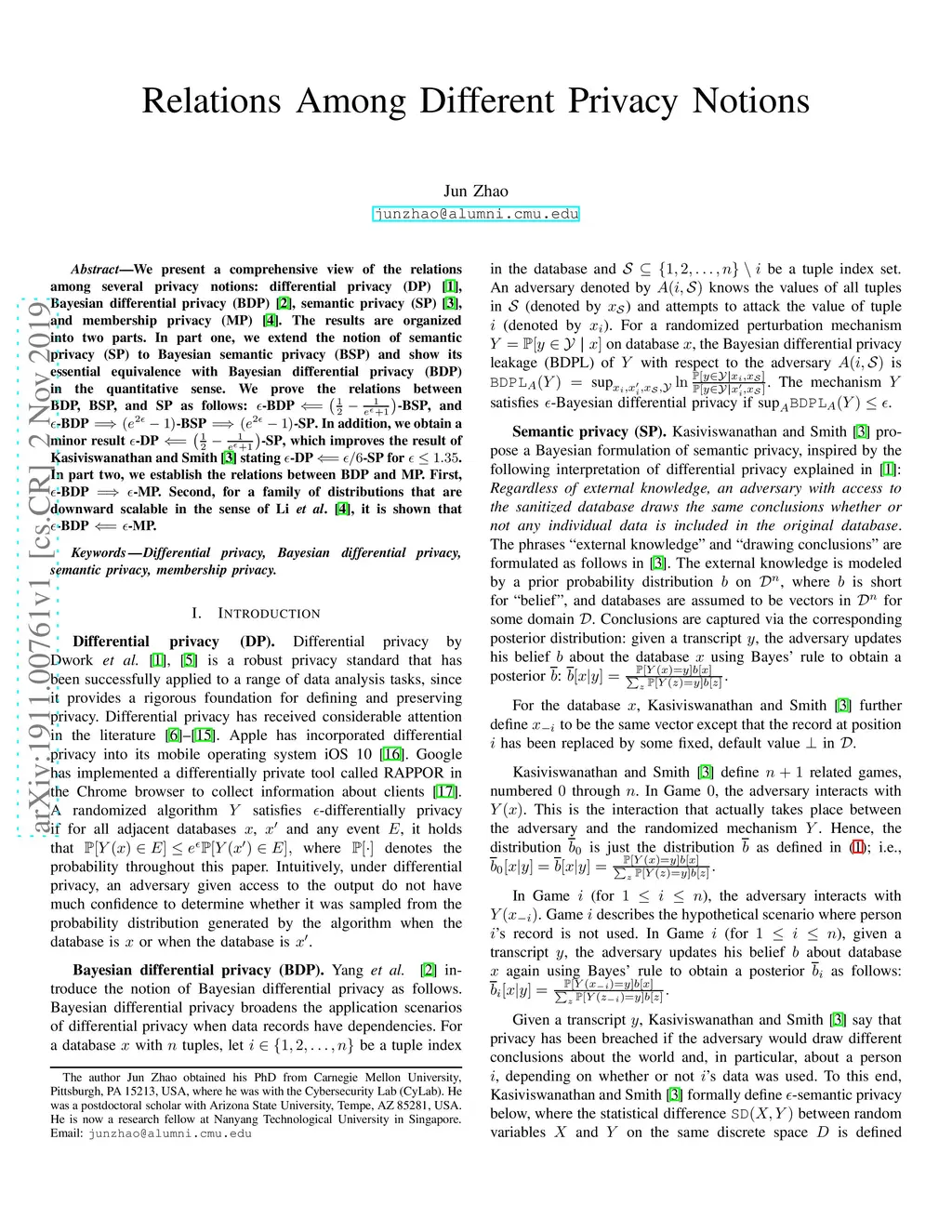 We present a comprehensive view of the relations among several privacy notions: differential privacy (DP) [1], Bayesian differential privacy (BDP) [2], semantic privacy (SP) [3], and membership privacy (MP) [4]. The results are organized into two parts. In part one, we extend the notion of semantic privacy (SP) to Bayesian semantic privacy (BSP) and show its essential equivalence with Bayesian differential privacy (BDP) in the quantitative sense. We prove the relations between BDP, BSP, and SP as follows: -BDP -BSP, and -BDP -BSP -SP. In addition, we obtain a minor result -DP -SP, which improves the result of Kasiviswanathan and Smith [3] stating -DP -SP for . In part two, we establish the relations between BDP and MP. First, -BDP -MP. Second, for a family of distributions that are downward scalable in the sense of Li et al. [4], it is shown that -BDP -MP.