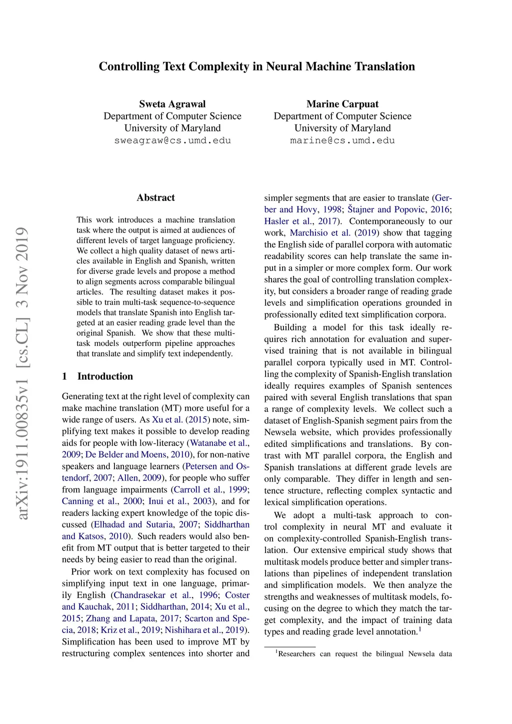 This work introduces a machine translation task where the output is aimed at audiences of different levels of target language proficiency. We collect a high quality dataset of news articles available in English and Spanish, written for diverse grade levels and propose a method to align segments across comparable bilingual articles. The resulting dataset makes it possible to train multi-task sequence-to-sequence models that translate Spanish into English targeted at an easier reading grade level than the original Spanish. We show that these multi-task models outperform pipeline approaches that translate and simplify text independently.