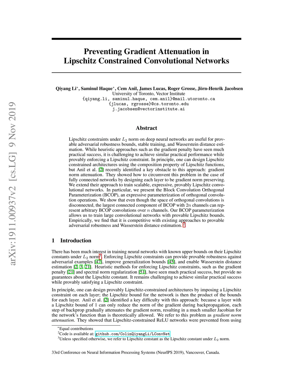Lipschitz constraints under L2 norm on deep neural networks are useful for provable adversarial robustness bounds, stable training, and Wasserstein distance estimation. While heuristic approaches such as the gradient penalty have seen much practical success, it is challenging to achieve similar practical performance while provably enforcing a Lipschitz constraint. In principle, one can design Lipschitz constrained architectures using the composition property of Lipschitz functions, but Anil et al. recently identified a key obstacle to this approach: gradient norm attenuation. They showed how to circumvent this problem in the case of fully connected networks by designing each layer to be gradient norm preserving. We extend their approach to train scalable, expressive, provably Lipschitz convolutional networks. In particular, we present the Block Convolution Orthogonal Parameterization (BCOP), an expressive parameterization of orthogonal convolution operations. We show that even though the space of orthogonal convolutions is disconnected, the largest connected component of BCOP with 2n channels can represent arbitrary BCOP convolutions over n channels. Our BCOP parameterization allows us to train large convolutional networks with provable Lipschitz bounds. Empirically, we find that it is competitive with existing approaches to provable adversarial robustness and Wasserstein distance estimation.
