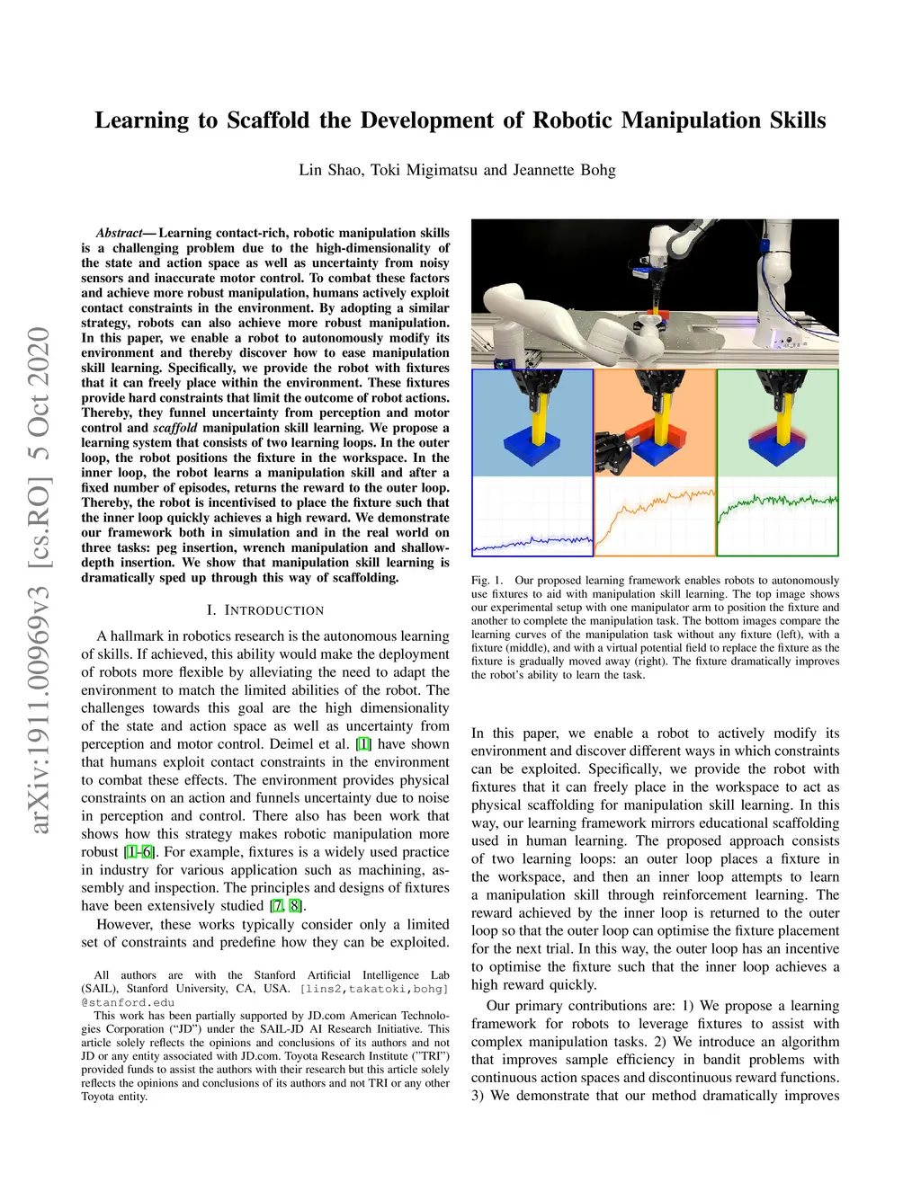 Learning contact-rich, robotic manipulation skills is a challenging problem due to the high-dimensionality of the state and action space as well as uncertainty from noisy sensors and inaccurate motor control. To combat these factors and achieve more robust manipulation, humans actively exploit contact constraints in the environment. By adopting a similar strategy, robots can also achieve more robust manipulation. In this paper, we enable a robot to autonomously modify its environment and thereby discover how to ease manipulation skill learning. Specifically, we provide the robot with fixtures that it can freely place within the environment. These fixtures provide hard constraints that limit the outcome of robot actions. Thereby, they funnel uncertainty from perception and motor control and scaffold manipulation skill learning. We propose a learning system that consists of two learning loops. In the outer loop, the robot positions the fixture in the workspace. In the inner loop, the robot learns a manipulation skill and after a fixed number of episodes, returns the reward to the outer loop. Thereby, the robot is incentivised to place the fixture such that the inner loop quickly achieves a high reward. We demonstrate our framework both in simulation and in the real world on three tasks: peg insertion, wrench manipulation and shallow-depth insertion. We show that manipulation skill learning is dramatically sped up through this way of scaffolding.