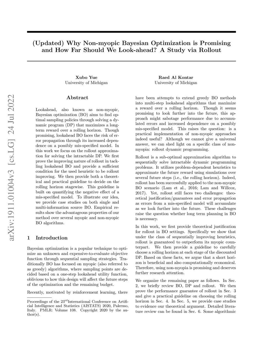Lookahead, also known as non-myopic, Bayesian optimization (BO) aims to find optimal sampling policies through solving a dynamic program (DP) that maximizes a long-term reward over a rolling horizon. Though promising, lookahead BO faces the risk of error propagation through its increased dependence on a possibly mis-specified model. In this work we focus on the rollout approximation for solving the intractable DP. We first prove the improving nature of rollout in tackling lookahead BO and provide a sufficient condition for the used heuristic to be rollout improving. We then provide both a theoretical and practical guideline to decide on the rolling horizon stagewise. This guideline is built on quantifying the negative effect of a mis-specified model. To illustrate our idea, we provide case studies on both single and multi-information source BO. Empirical results show the advantageous properties of our method over several myopic and non-myopic BO algorithms.