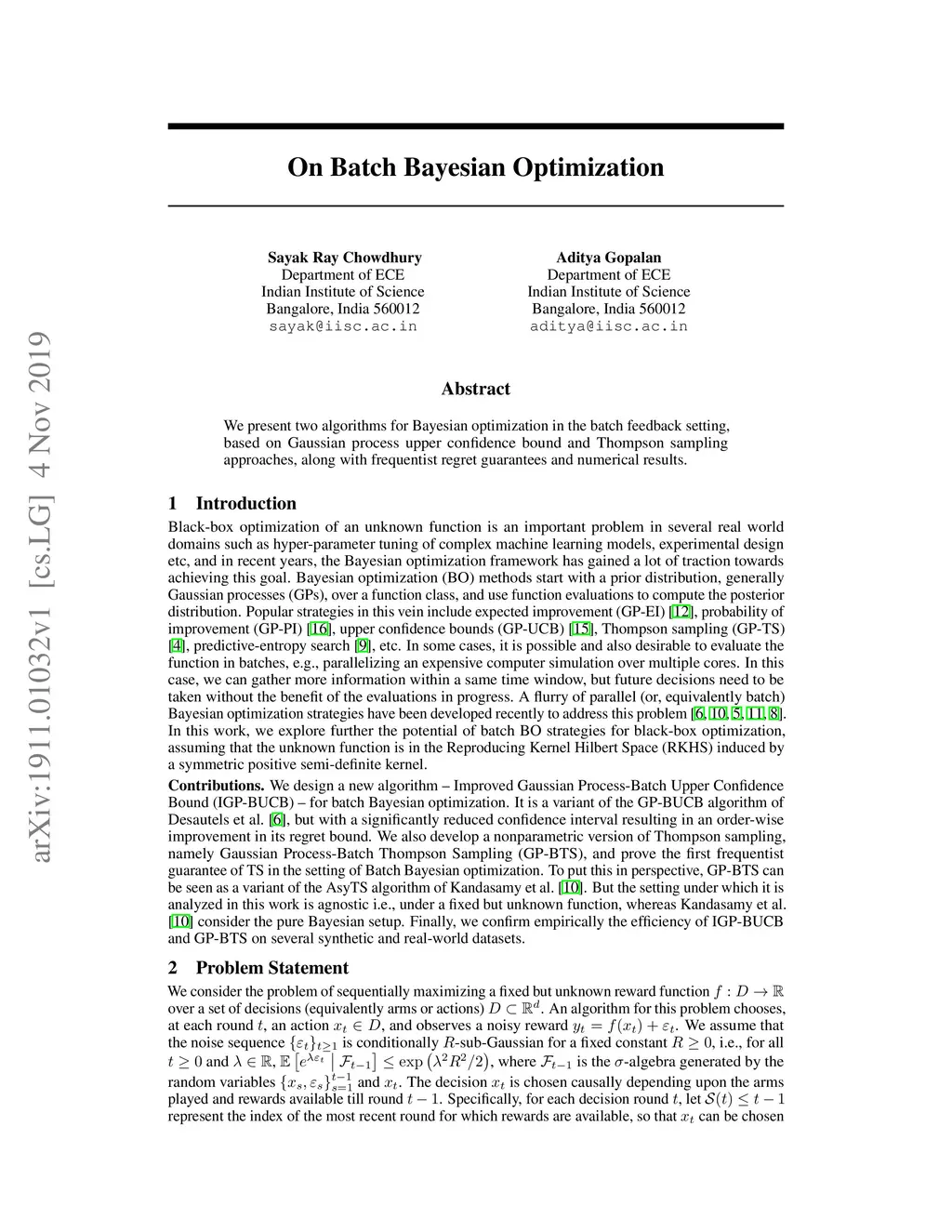 We present two algorithms for Bayesian optimization in the batch feedback setting, based on Gaussian process upper confidence bound and Thompson sampling approaches, along with frequentist regret guarantees and numerical results.