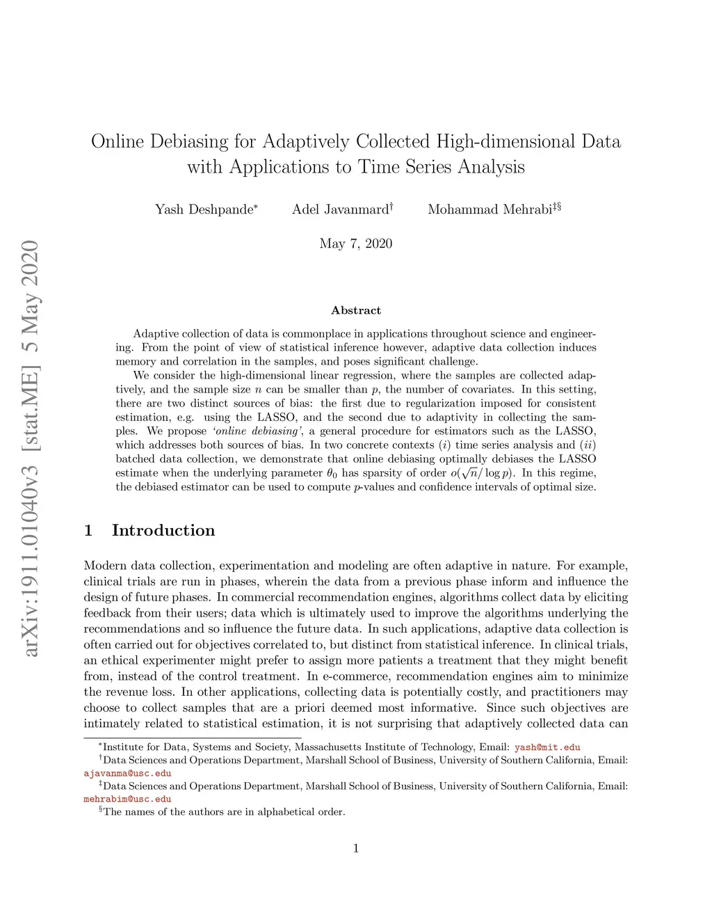 Adaptive collection of data is commonplace in applications throughout science and engineering. From the point of view of statistical inference however, adaptive data collection induces memory and correlation in the samples, and poses significant challenge. We consider the high-dimensional linear regression, where the samples are collected adaptively, and the sample size can be smaller than , the number of covariates. In this setting, there are two distinct sources of bias: the first due to regularization imposed for consistent estimation, e.g. using the LASSO, and the second due to adaptivity in collecting the samples. We propose "online debiasing", a general procedure for estimators such as the LASSO, which addresses both sources of bias. In two concrete contexts time series analysis and batched data collection, we demonstrate that online debiasing optimally debiases the LASSO estimate when the underlying parameter has sparsity of order . In this regime, the debiased estimator can be used to compute -values and confidence intervals of optimal size.