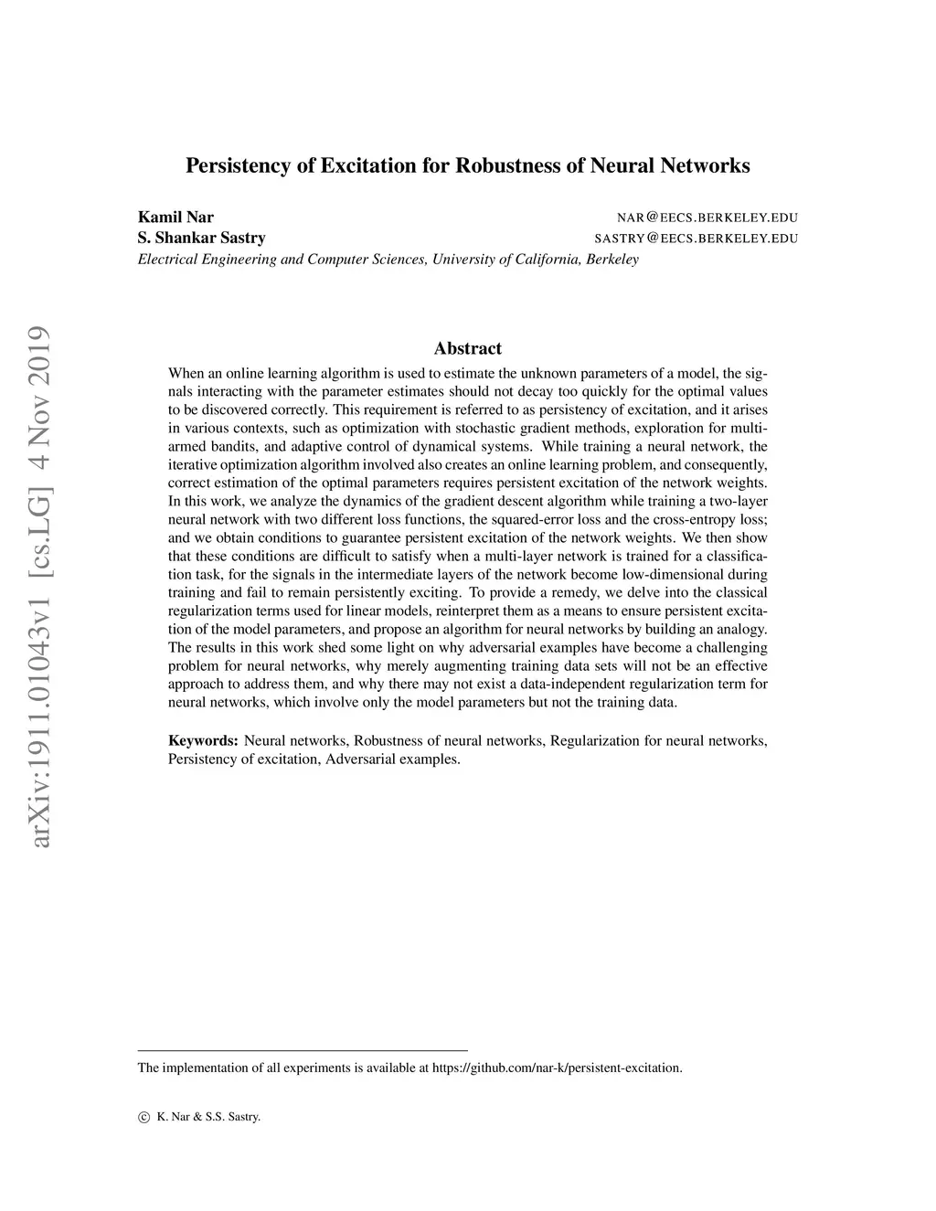 When an online learning algorithm is used to estimate the unknown parameters of a model, the signals interacting with the parameter estimates should not decay too quickly for the optimal values to be discovered correctly. This requirement is referred to as persistency of excitation, and it arises in various contexts, such as optimization with stochastic gradient methods, exploration for multi-armed bandits, and adaptive control of dynamical systems. While training a neural network, the iterative optimization algorithm involved also creates an online learning problem, and consequently, correct estimation of the optimal parameters requires persistent excitation of the network weights. In this work, we analyze the dynamics of the gradient descent algorithm while training a two-layer neural network with two different loss functions, the squared-error loss and the cross-entropy loss; and we obtain conditions to guarantee persistent excitation of the network weights. We then show that these conditions are difficult to satisfy when a multi-layer network is trained for a classification task, for the signals in the intermediate layers of the network become low-dimensional during training and fail to remain persistently exciting. To provide a remedy, we delve into the classical regularization terms used for linear models, reinterpret them as a means to ensure persistent excitation of the model parameters, and propose an algorithm for neural networks by building an analogy. The results in this work shed some light on why adversarial examples have become a challenging problem for neural networks, why merely augmenting training data sets will not be an effective approach to address them, and why there may not exist a data-independent regularization term for neural networks, which involve only the model parameters but not the training data.