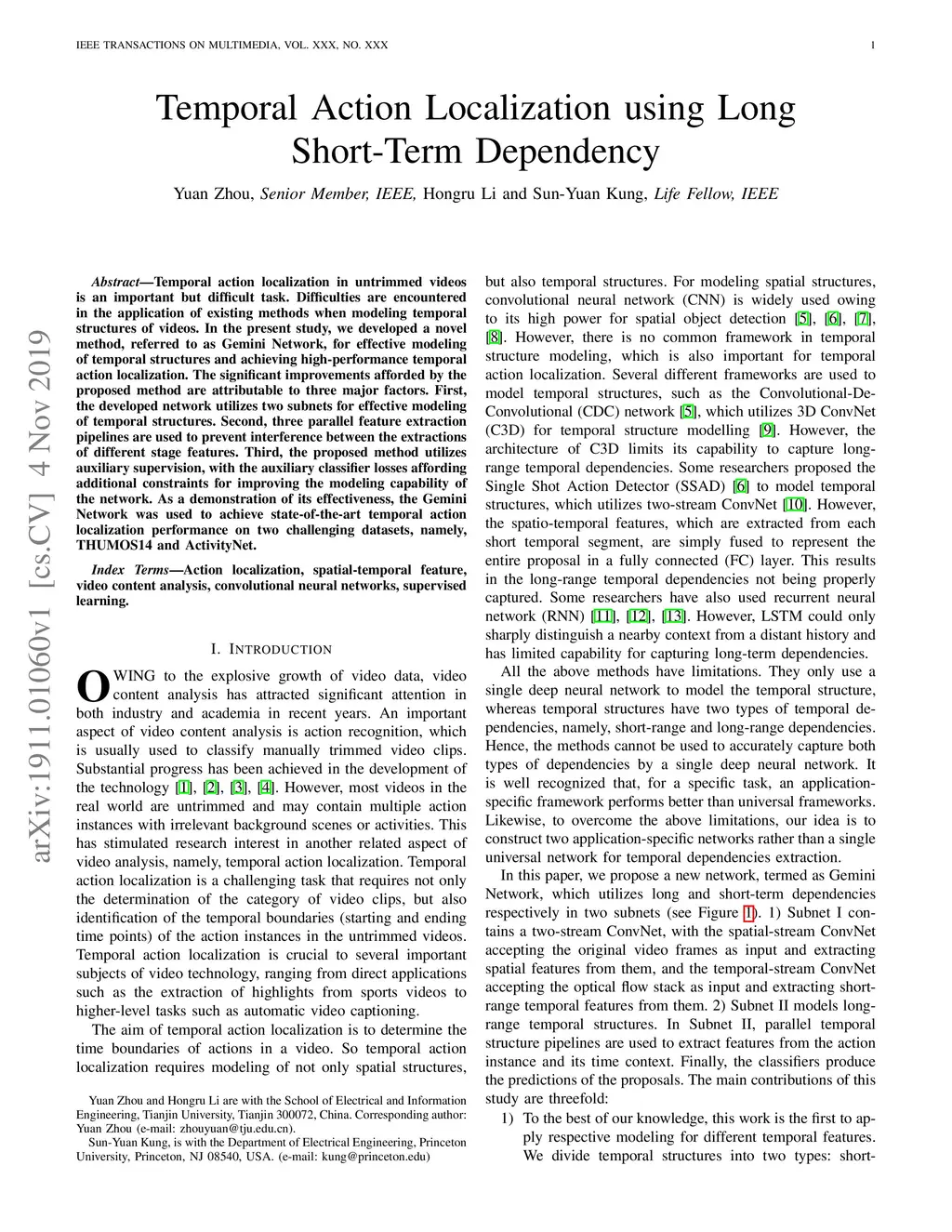 Temporal action localization in untrimmed videos is an important but difficult task. Difficulties are encountered in the application of existing methods when modeling temporal structures of videos. In the present study, we developed a novel method, referred to as Gemini Network, for effective modeling of temporal structures and achieving high-performance temporal action localization. The significant improvements afforded by the proposed method are attributable to three major factors. First, the developed network utilizes two subnets for effective modeling of temporal structures. Second, three parallel feature extraction pipelines are used to prevent interference between the extractions of different stage features. Third, the proposed method utilizes auxiliary supervision, with the auxiliary classifier losses affording additional constraints for improving the modeling capability of the network. As a demonstration of its effectiveness, the Gemini Network was used to achieve state-of-the-art temporal action localization performance on two challenging datasets, namely, THUMOS14 and ActivityNet.