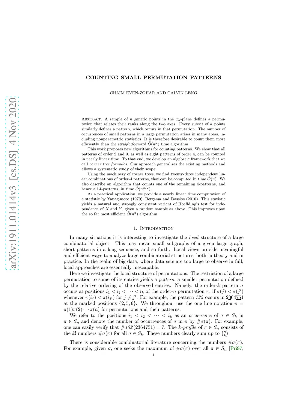 A sample of n generic points in the xy-plane defines a permutation that relates their ranks along the two axes. Every subset of k points similarly defines a pattern, which occurs in that permutation. The number of occurrences of small patterns in a large permutation arises in many areas, including nonparametric statistics. It is therefore desirable to count them more efficiently than the straightforward ~O(n^k) time algorithm. This work proposes new algorithms for counting patterns. We show that all patterns of order 2 and 3, as well as eight patterns of order 4, can be counted in nearly linear time. To that end, we develop an algebraic framework that we call corner tree formulas. Our approach generalizes the existing methods and allows a systematic study of their scope. Using the machinery of corner trees, we find twenty-three independent linear combinations of order-4 patterns, that can be computed in time ~O(n). We also describe an algorithm that counts one of the remaining 4-patterns, and hence all 4-patterns, in time ~O(n^(3/2)). As a practical application, we provide a nearly linear time computation of a statistic by Yanagimoto (1970), Bergsma and Dassios (2010). This statistic yields a natural and strongly consistent variant of Hoeffding's test for independence of X and Y, given a random sample as above. This improves upon the so far most efficient ~O(n^2) algorithm.