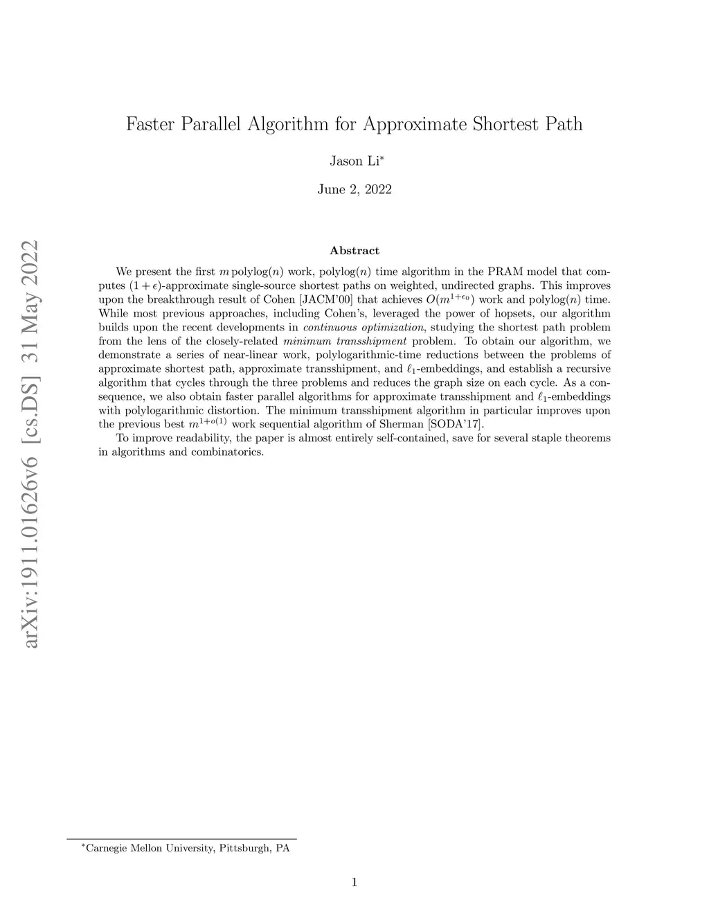 We present the first work, time algorithm in the PRAM model that computes -approximate single-source shortest paths on weighted, undirected graphs. This improves upon the breakthrough result of Cohen~[JACM'00] that achieves work and time. While most previous approaches, including Cohen's, leveraged the power of hopsets, our algorithm builds upon the recent developments in \emph{continuous optimization}, studying the shortest path problem from the lens of the closely-related \emph{minimum transshipment} problem. To obtain our algorithm, we demonstrate a series of near-linear work, polylogarithmic-time reductions between the problems of approximate shortest path, approximate transshipment, and -embeddings, and establish a recursive algorithm that cycles through the three problems and reduces the graph size on each cycle. As a consequence, we also obtain faster parallel algorithms for approximate transshipment and -embeddings with polylogarithmic distortion. The minimum transshipment algorithm in particular improves upon the previous best work sequential algorithm of Sherman~[SODA'17]. To improve readability, the paper is almost entirely self-contained, save for several staple theorems in algorithms and combinatorics.