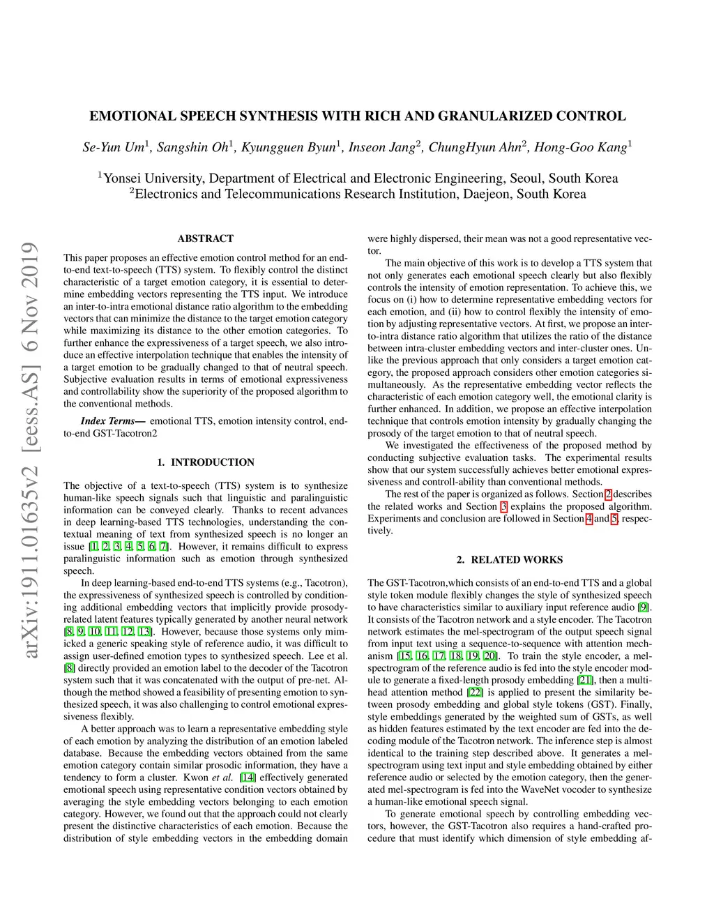 This paper proposes an effective emotion control method for an end-to-end text-to-speech (TTS) system. To flexibly control the distinct characteristic of a target emotion category, it is essential to determine embedding vectors representing the TTS input. We introduce an inter-to-intra emotional distance ratio algorithm to the embedding vectors that can minimize the distance to the target emotion category while maximizing its distance to the other emotion categories. To further enhance the expressiveness of a target speech, we also introduce an effective interpolation technique that enables the intensity of a target emotion to be gradually changed to that of neutral speech. Subjective evaluation results in terms of emotional expressiveness and controllability show the superiority of the proposed algorithm to the conventional methods.