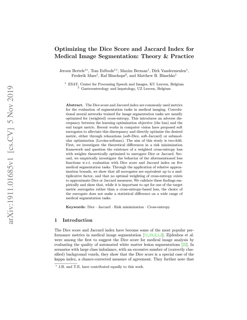 The Dice score and Jaccard index are commonly used metrics for the evaluation of segmentation tasks in medical imaging. Convolutional neural networks trained for image segmentation tasks are usually optimized for (weighted) cross-entropy. This introduces an adverse discrepancy between the learning optimization objective (the loss) and the end target metric. Recent works in computer vision have proposed soft surrogates to alleviate this discrepancy and directly optimize the desired metric, either through relaxations (soft-Dice, soft-Jaccard) or submodular optimization (Lov\ász-softmax). The aim of this study is two-fold. First, we investigate the theoretical differences in a risk minimization framework and question the existence of a weighted cross-entropy loss with weights theoretically optimized to surrogate Dice or Jaccard. Second, we empirically investigate the behavior of the aforementioned loss functions w.r.t. evaluation with Dice score and Jaccard index on five medical segmentation tasks. Through the application of relative approximation bounds, we show that all surrogates are equivalent up to a multiplicative factor, and that no optimal weighting of cross-entropy exists to approximate Dice or Jaccard measures. We validate these findings empirically and show that, while it is important to opt for one of the target metric surrogates rather than a cross-entropy-based loss, the choice of the surrogate does not make a statistical difference on a wide range of medical segmentation tasks.