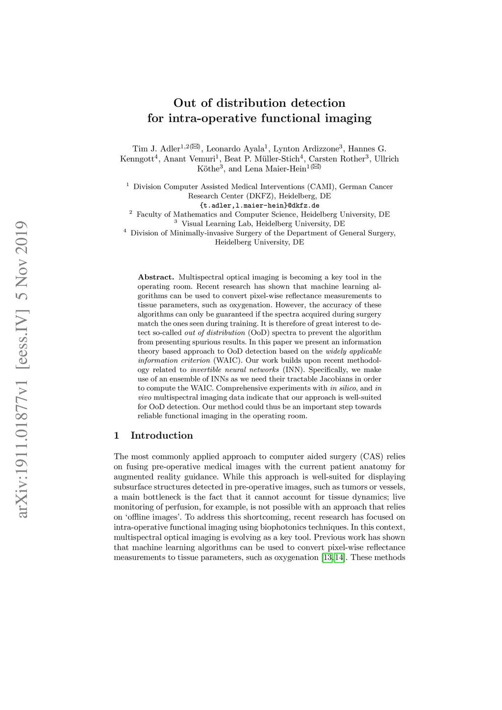 Multispectral optical imaging is becoming a key tool in the operating room. Recent research has shown that machine learning algorithms can be used to convert pixel-wise reflectance measurements to tissue parameters, such as oxygenation. However, the accuracy of these algorithms can only be guaranteed if the spectra acquired during surgery match the ones seen during training. It is therefore of great interest to detect so-called out of distribution (OoD) spectra to prevent the algorithm from presenting spurious results. In this paper we present an information theory based approach to OoD detection based on the widely applicable information criterion (WAIC). Our work builds upon recent methodology related to invertible neural networks (INN). Specifically, we make use of an ensemble of INNs as we need their tractable Jacobians in order to compute the WAIC. Comprehensive experiments with in silico, and in vivo multispectral imaging data indicate that our approach is well-suited for OoD detection. Our method could thus be an important step towards reliable functional imaging in the operating room.