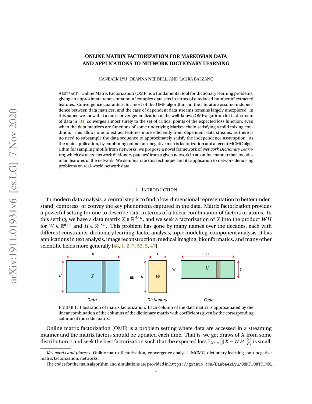 Online Matrix Factorization (OMF) is a fundamental tool for dictionary learning problems, giving an approximate representation of complex data sets in terms of a reduced number of extracted features. Convergence guarantees for most of the OMF algorithms in the literature assume independence between data matrices, and the case of dependent data streams remains largely unexplored. In this paper, we show that a non-convex generalization of the well-known OMF algorithm for i.i.d. stream of data in \citep{mairal2010online} converges almost surely to the set of critical points of the expected loss function, even when the data matrices are functions of some underlying Markov chain satisfying a mild mixing condition. This allows one to extract features more efficiently from dependent data streams, as there is no need to subsample the data sequence to approximately satisfy the independence assumption. As the main application, by combining online non-negative matrix factorization and a recent MCMC algorithm for sampling motifs from networks, we propose a novel framework of Network Dictionary Learning, which extracts ``network dictionary patches' from a given network in an online manner that encodes main features of the network. We demonstrate this technique and its application to network denoising problems on real-world network data.