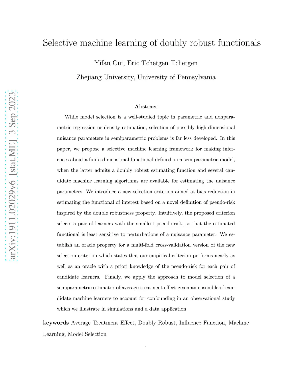 While model selection is a well-studied topic in parametric and nonparametric regression or density estimation, selection of possibly high-dimensional nuisance parameters in semiparametric problems is far less developed. In this paper, we propose a selective machine learning framework for making inferences about a finite-dimensional functional defined on a semiparametric model, when the latter admits a doubly robust estimating function and several candidate machine learning algorithms are available for estimating the nuisance parameters. We introduce two new selection criteria for bias reduction in estimating the functional of interest, each based on a novel definition of pseudo-risk for the functional that embodies the double robustness property and thus is used to select the pair of learners that is nearest to fulfilling this property. We establish an oracle property for a multi-fold cross-validation version of the new selection criteria which states that our empirical criteria perform nearly as well as an oracle with a priori knowledge of the pseudo-risk for each pair of candidate learners. We also describe a smooth approximation to the selection criteria which allows for valid post-selection inference. Finally, we apply the approach to model selection of a semiparametric estimator of average treatment effect given an ensemble of candidate machine learners to account for confounding in an observational study.