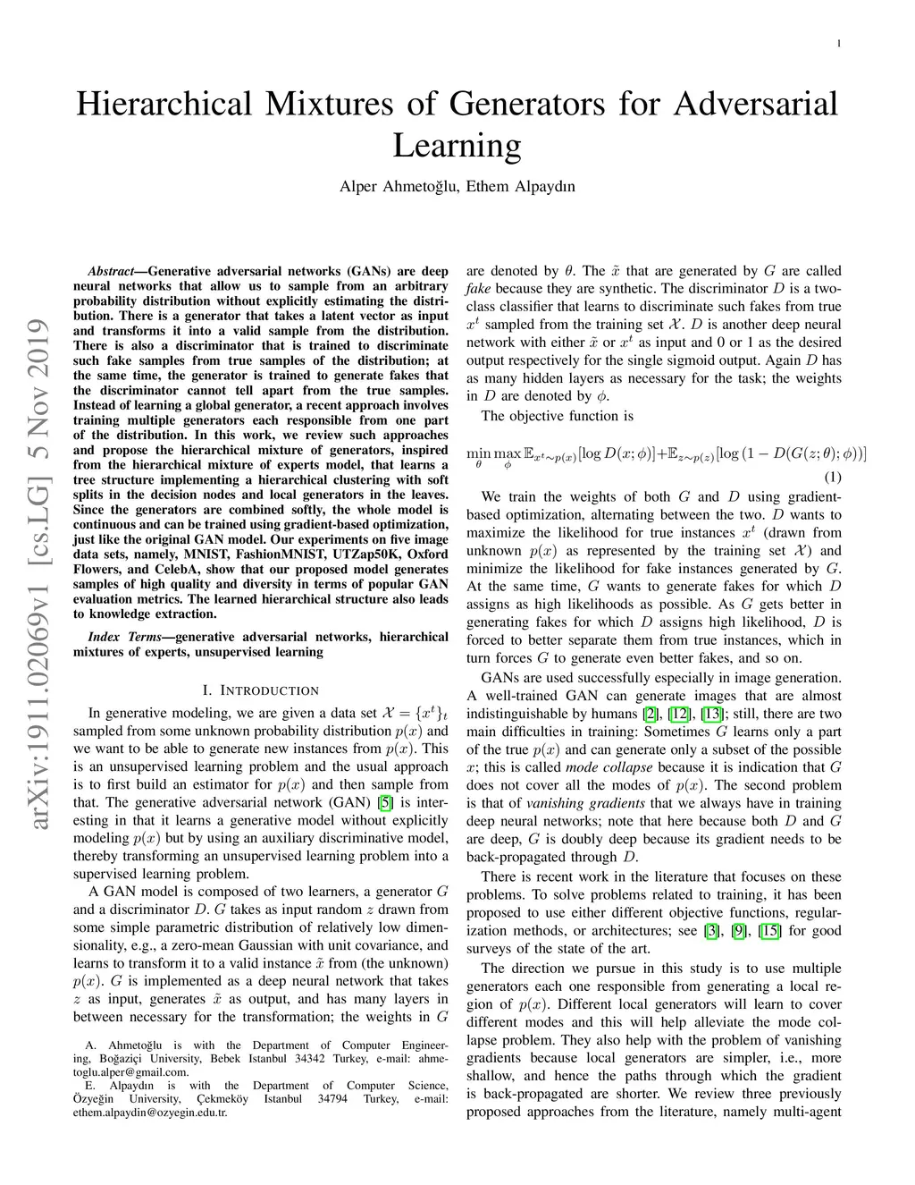 Hierarchical Mixtures of Generators for Adversarial Learning