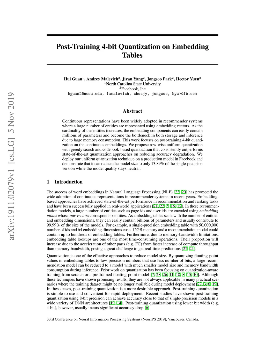 Continuous representations have been widely adopted in recommender systems where a large number of entities are represented using embedding vectors. As the cardinality of the entities increases, the embedding components can easily contain millions of parameters and become the bottleneck in both storage and inference due to large memory consumption. This work focuses on post-training 4-bit quantization on the continuous embeddings. We propose row-wise uniform quantization with greedy search and codebook-based quantization that consistently outperforms state-of-the-art quantization approaches on reducing accuracy degradation. We deploy our uniform quantization technique on a production model in Facebook and demonstrate that it can reduce the model size to only 13.89% of the single-precision version while the model quality stays neutral.
