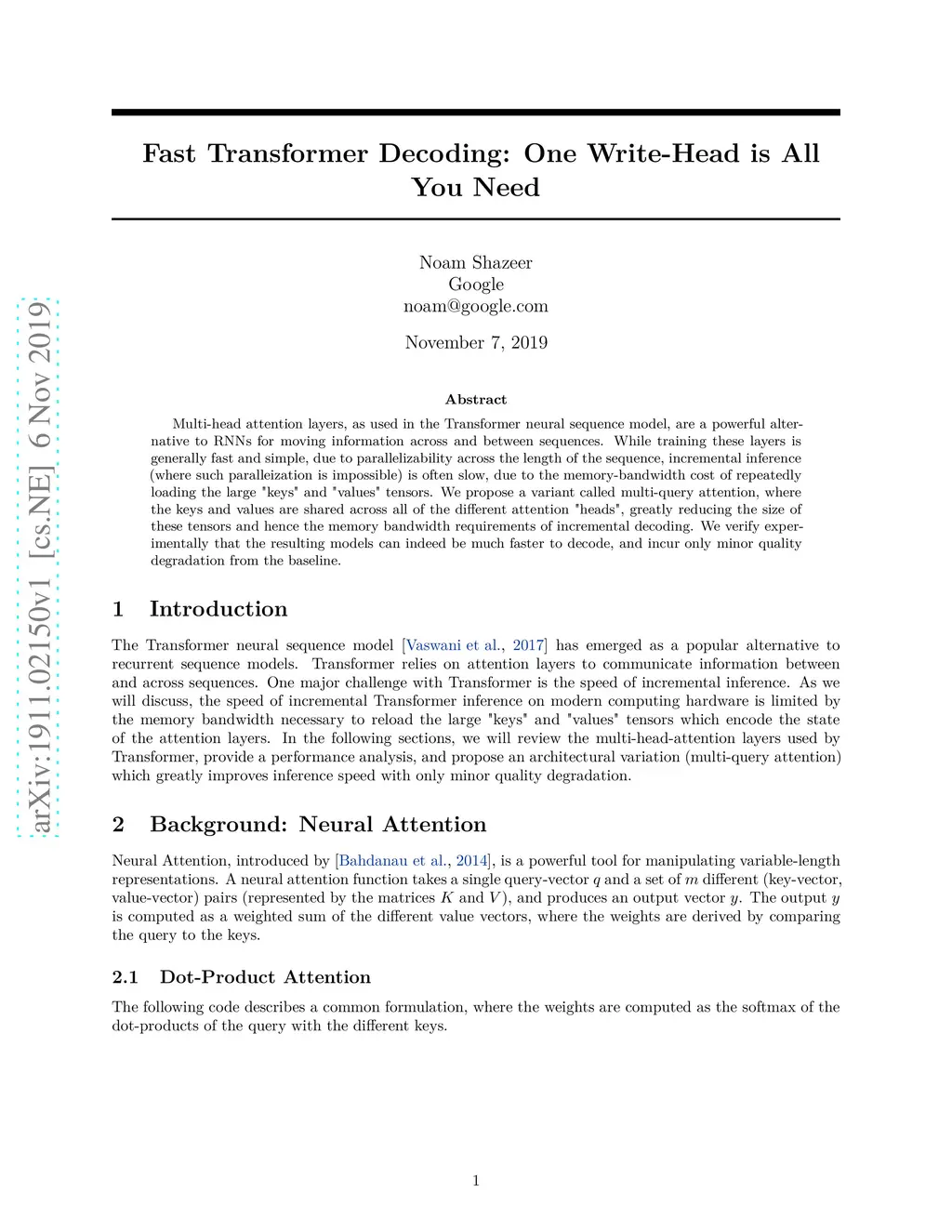 Fast Transformer Decoding: One Write-Head is All You Need