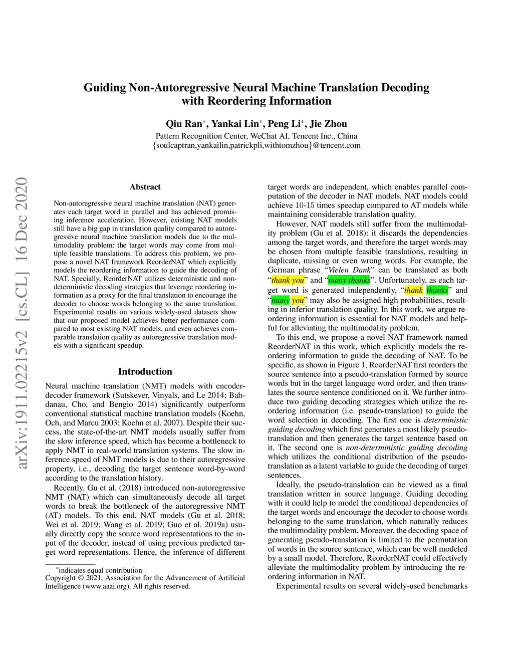Non-autoregressive neural machine translation (NAT) generates each target word in parallel and has achieved promising inference acceleration. However, existing NAT models still have a big gap in translation quality compared to autoregressive neural machine translation models due to the enormous decoding space. To address this problem, we propose a novel NAT framework named ReorderNAT which explicitly models the reordering information in the decoding procedure. We further introduce deterministic and non-deterministic decoding strategies that utilize reordering information to narrow the decoding search space in our proposed ReorderNAT. Experimental results on various widely-used datasets show that our proposed model achieves better performance compared to existing NAT models, and even achieves comparable translation quality as autoregressive translation models with a significant speedup.