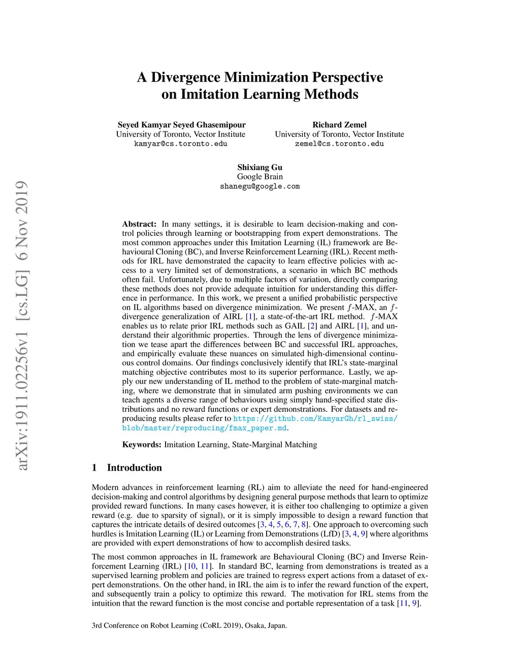 In many settings, it is desirable to learn decision-making and control policies through learning or bootstrapping from expert demonstrations. The most common approaches under this Imitation Learning (IL) framework are Behavioural Cloning (BC), and Inverse Reinforcement Learning (IRL). Recent methods for IRL have demonstrated the capacity to learn effective policies with access to a very limited set of demonstrations, a scenario in which BC methods often fail. Unfortunately, due to multiple factors of variation, directly comparing these methods does not provide adequate intuition for understanding this difference in performance. In this work, we present a unified probabilistic perspective on IL algorithms based on divergence minimization. We present -MAX, an -divergence generalization of AIRL [Fu et al., 2018], a state-of-the-art IRL method. -MAX enables us to relate prior IRL methods such as GAIL [Ho & Ermon, 2016] and AIRL [Fu et al., 2018], and understand their algorithmic properties. Through the lens of divergence minimization we tease apart the differences between BC and successful IRL approaches, and empirically evaluate these nuances on simulated high-dimensional continuous control domains. Our findings conclusively identify that IRL's state-marginal matching objective contributes most to its superior performance. Lastly, we apply our new understanding of IL methods to the problem of state-marginal matching, where we demonstrate that in simulated arm pushing environments we can teach agents a diverse range of behaviours using simply hand-specified state distributions and no reward functions or expert demonstrations. For datasets and reproducing results please refer to https://github.com/KamyarGh/rl_swiss/blob/master/reproducing/fmax_paper.md .