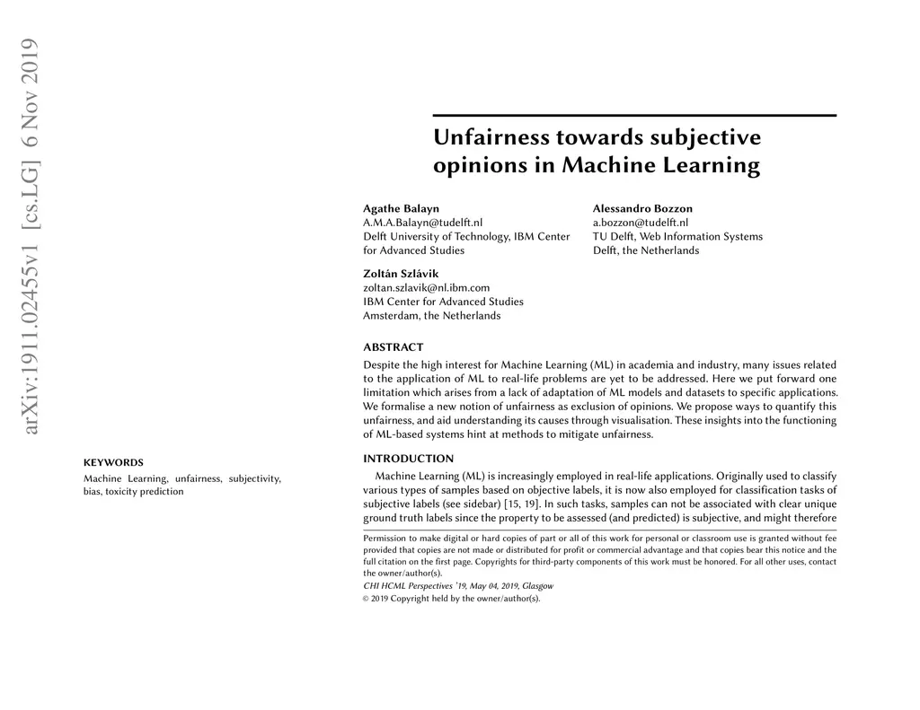 Unfairness towards subjective opinions in Machine Learning