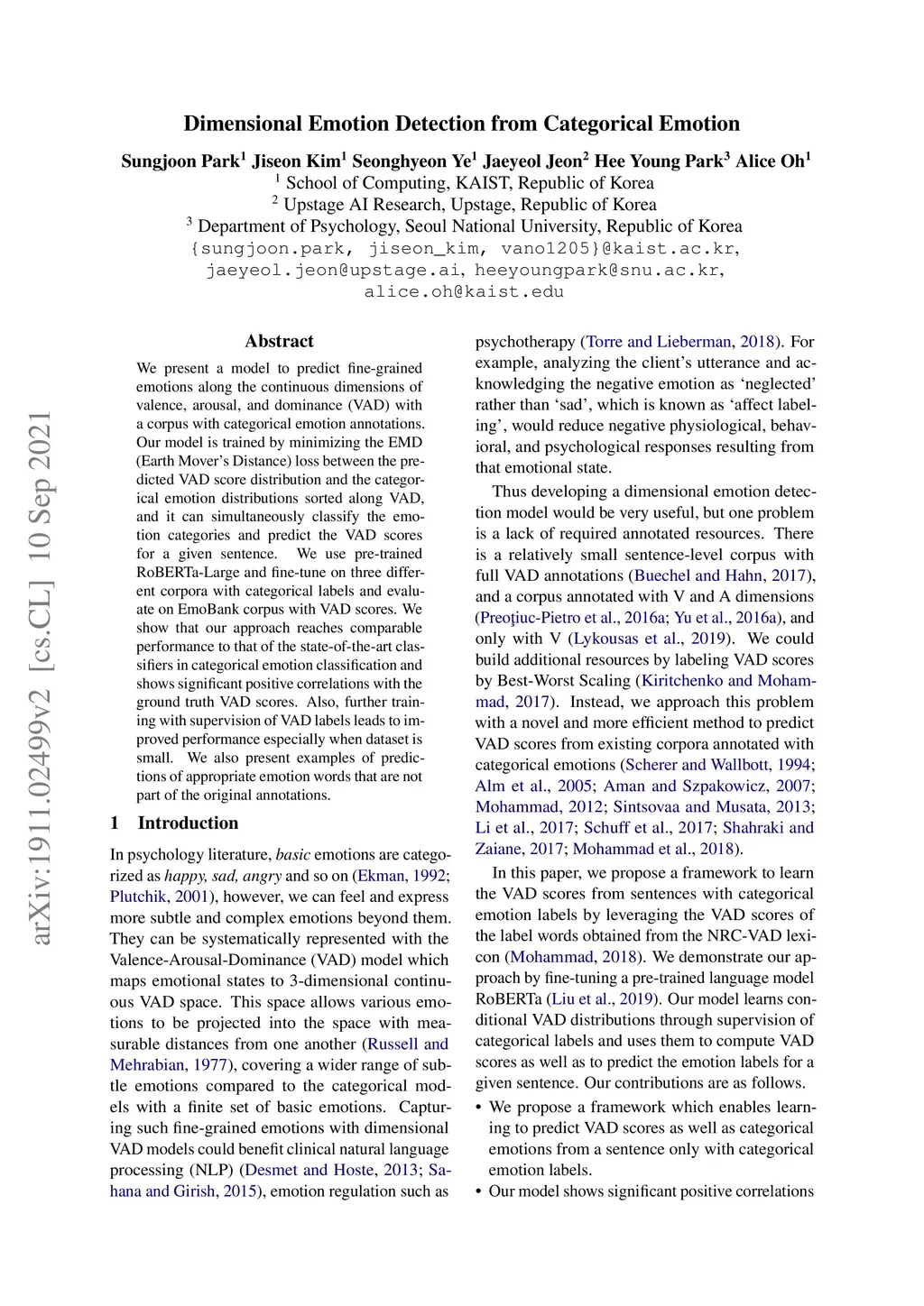 We present a model to predict fine-grained emotions along the continuous dimensions of valence, arousal, and dominance (VAD) with a corpus with categorical emotion annotations. Our model is trained by minimizing the EMD (Earth Mover's Distance) loss between the predicted VAD score distribution and the categorical emotion distributions sorted along VAD, and it can simultaneously classify the emotion categories and predict the VAD scores for a given sentence. We use pre-trained RoBERTa-Large and fine-tune on three different corpora with categorical labels and evaluate on EmoBank corpus with VAD scores. We show that our approach reaches comparable performance to that of the state-of-the-art classifiers in categorical emotion classification and shows significant positive correlations with the ground truth VAD scores. Also, further training with supervision of VAD labels leads to improved performance especially when dataset is small. We also present examples of predictions of appropriate emotion words that are not part of the original annotations.