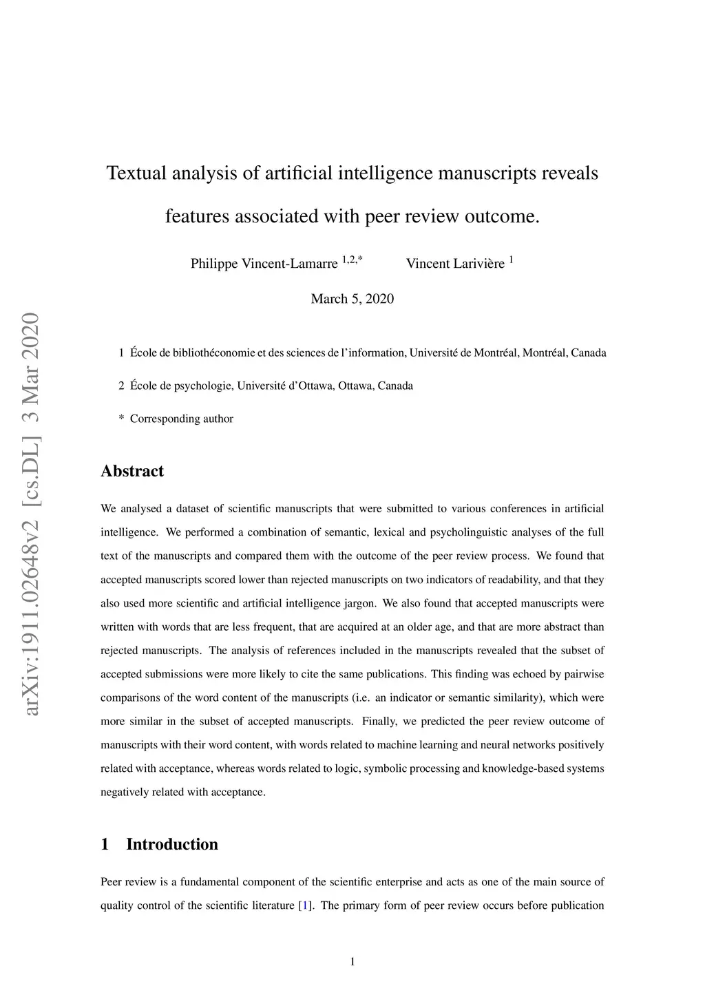 We analysed a recently released dataset of scientific manuscripts that were either rejected or accepted from various conferences in artificial intelligence. We used a combination of semantic, lexical and psycholinguistic analyses of the full text of the manuscripts to compare them based on the outcome of the peer review process. We found that accepted manuscripts were written with words that are less frequent, that are acquired at an older age, and that are more abstract than rejected manuscripts. We also found that accepted manuscripts scored lower on two indicators of readability than rejected manuscripts, and that they also used more artificial intelligence jargon. An analysis of the references included in the manuscripts revealed that the subset of accepted submissions were more likely to cite the same publications. This finding was echoed by pairwise comparisons of the word content of the manuscripts (i.e. an indicator or semantic similarity), which was higher in the accepted manuscripts. Finally, we predicted the peer review outcome of manuscripts with their word content, with words related to machine learning and neural networks positively related with acceptance, whereas words related to logic, symbolic processing and knowledge-based systems negatively related with acceptance.