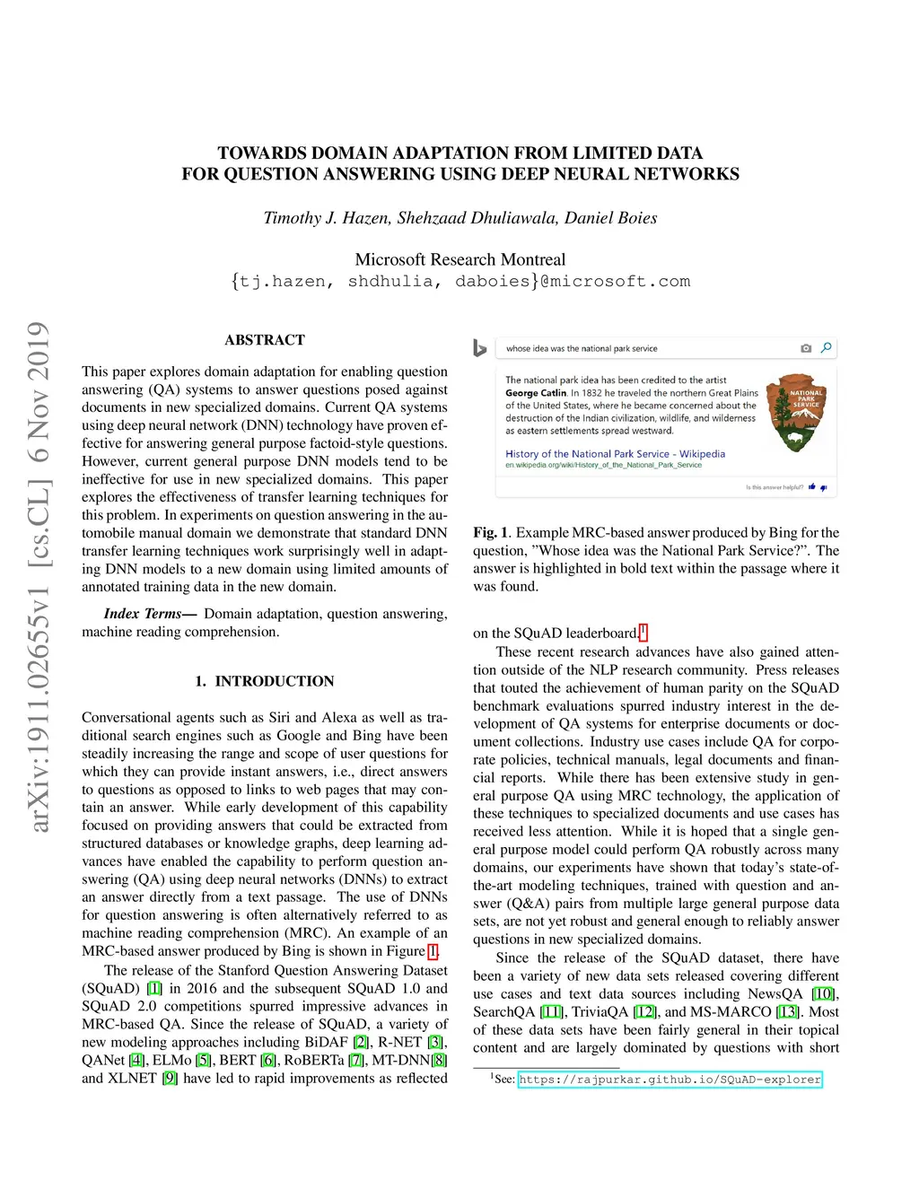 This paper explores domain adaptation for enabling question answering (QA) systems to answer questions posed against documents in new specialized domains. Current QA systems using deep neural network (DNN) technology have proven effective for answering general purpose factoid-style questions. However, current general purpose DNN models tend to be ineffective for use in new specialized domains. This paper explores the effectiveness of transfer learning techniques for this problem. In experiments on question answering in the automobile manual domain we demonstrate that standard DNN transfer learning techniques work surprisingly well in adapting DNN models to a new domain using limited amounts of annotated training data in the new domain.