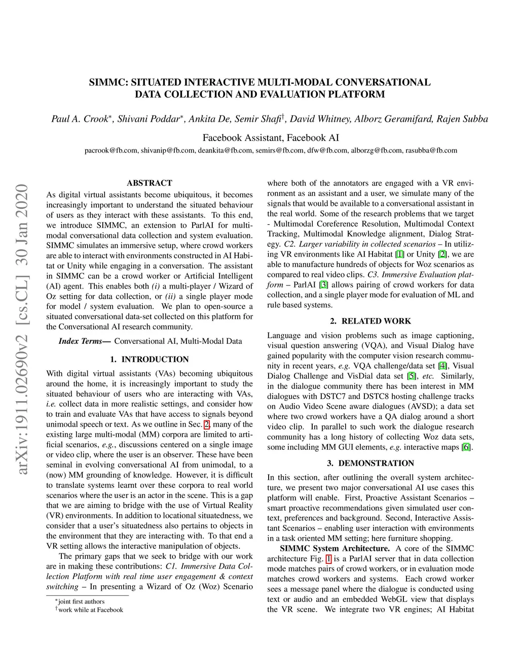 As digital virtual assistants become ubiquitous, it becomes increasingly important to understand the situated behaviour of users as they interact with these assistants. To this end, we introduce SIMMC, an extension to ParlAI for multi-modal conversational data collection and system evaluation. SIMMC simulates an immersive setup, where crowd workers are able to interact with environments constructed in AI Habitat or Unity while engaging in a conversation. The assistant in SIMMC can be a crowd worker or Artificial Intelligent (AI) agent. This enables both (i) a multi-player / Wizard of Oz setting for data collection, or (ii) a single player mode for model / system evaluation. We plan to open-source a situated conversational data-set collected on this platform for the Conversational AI research community.